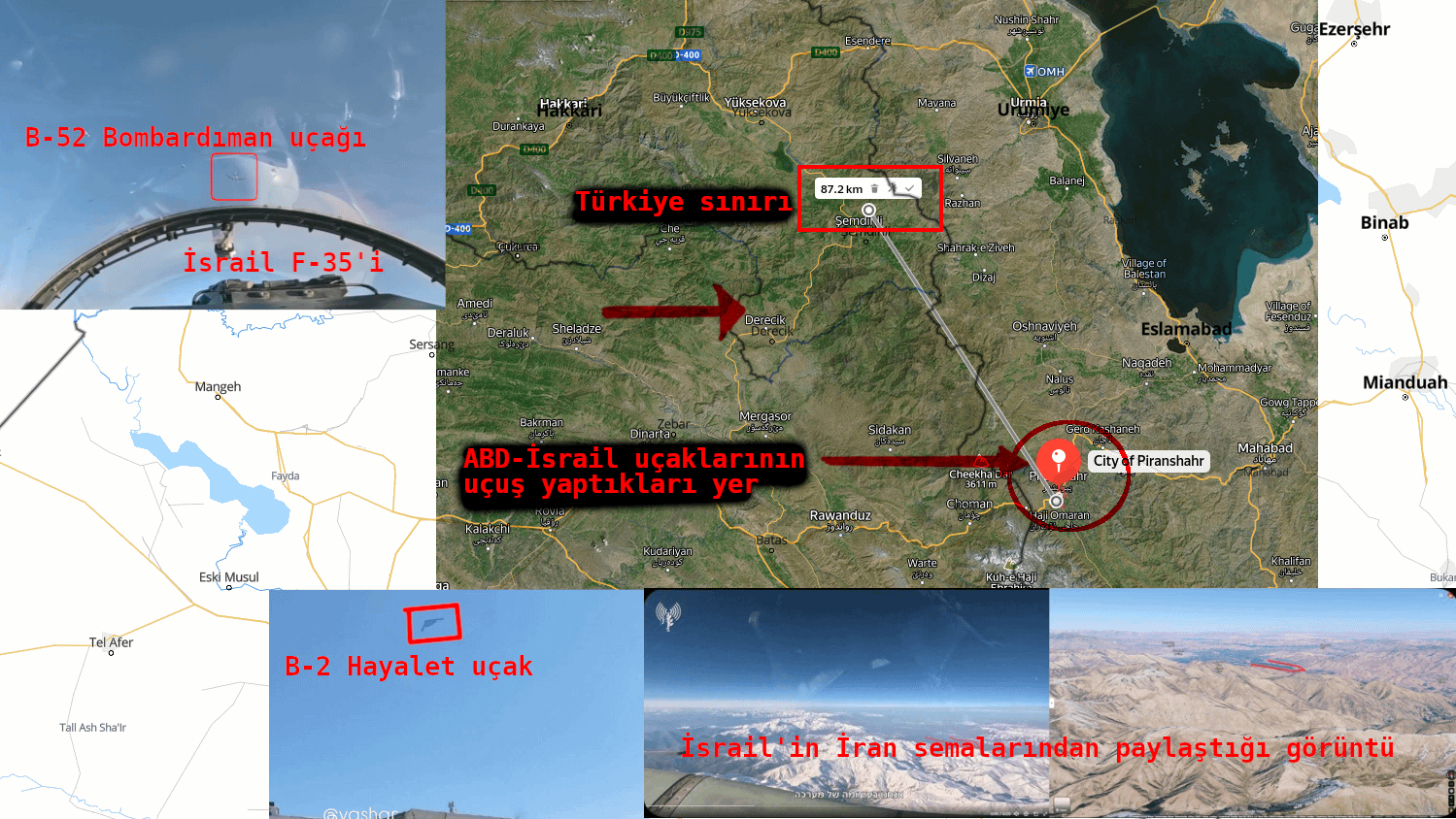 Non condividerò il collegamento del video. Nel filmato, i bombardieri statunitensi B-2 e B-52 e gli aerei da combattimento israeliani volano insieme. Ci sono stazioni di polizia non solo sul lato turco del confine ma anche sul lato iracheno. Dare armi ai terroristi qui avrà conseguenze pericolose per tutti coloro che sono soggetti al servizio militare obbligatorio alla frontiera, in particolare per i soldati della parte irachena.