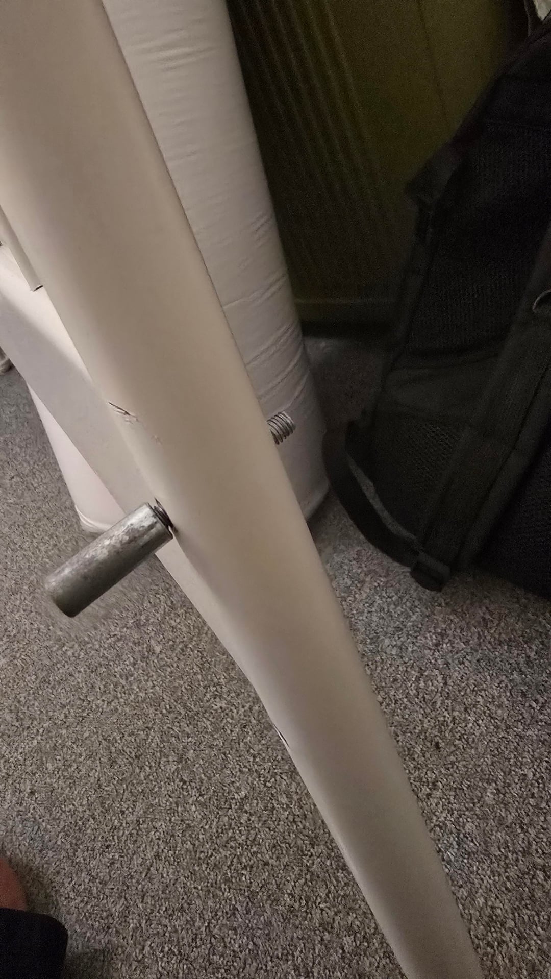 Ho anche questi pin di connettore argentati (filettati su un lato e cilindrici lisci sull’altro), ma quando provo ad avvitarli nei fori delle gambe non c’è nulla in cui possano mordere: i fori passano direttamente attraverso il tubo.