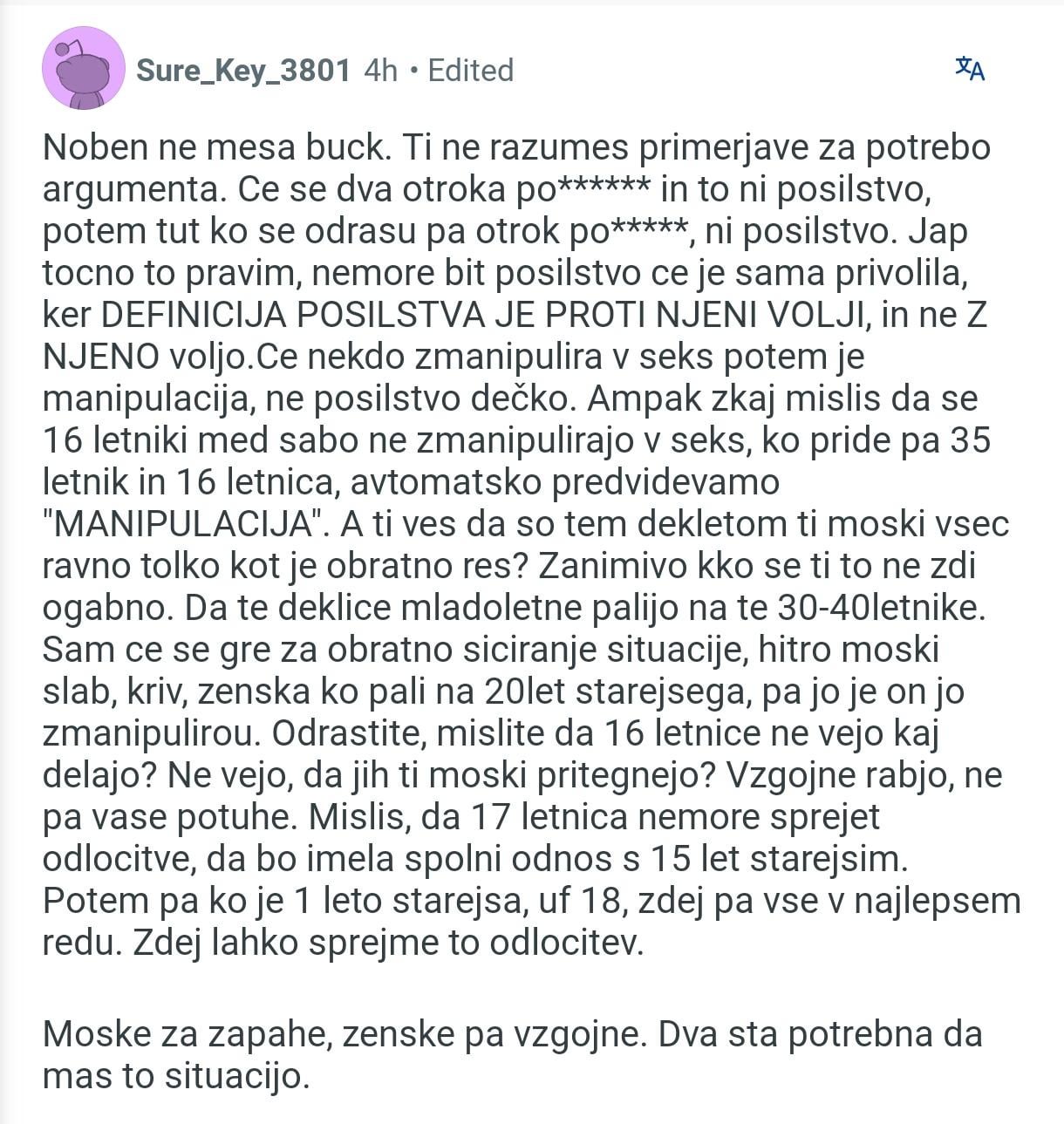 Absolutno ne podpiram tega, ampak obenem razumem kaj hoče povedat. Lahko maš 16letnega playerja ki ženske že takrat manipulira in ne vem, 23-letnika ki normalno hodi ven in slučajno zahakla eno ki je 16/17 in ni nujno niti vedel da je mladoletna.