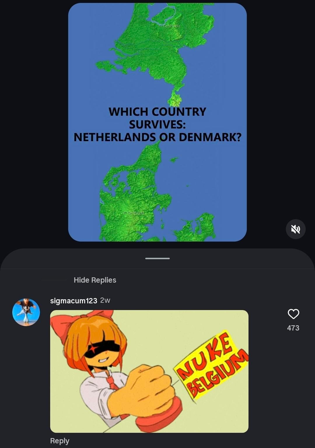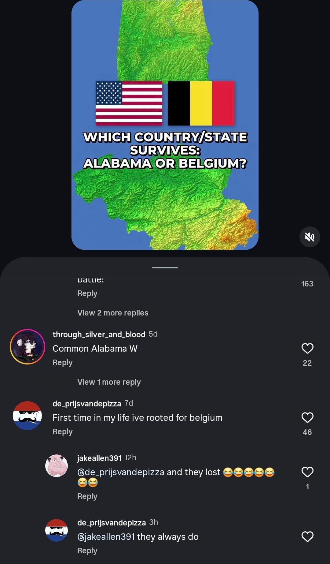 Quindi ecco un account IG che mette semplicemente due stati o regioni uno contro l’altro e che affonderà per primo. Quindi non c’è niente di politico, niente nel paese oltre all’elevazione. In Belgio vs Alabama, almeno 3 olandesi non riescono a smettere di essere razzisti. Ma anche quando controlli Olanda vs Danimarca, qualcuno deve comunque postare "Nuclearizzare il Belgio".