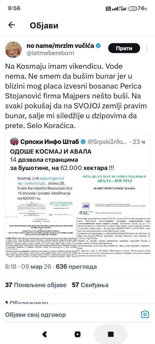 Ho già detto che sicuramente non c’è acqua a causa delle azioni illegali del Millennium Team e della cooperativa idrica, ma ora alle persone è vietato costruire pozzi! A noi persone non rimarrà una goccia d’acqua pulita, per non parlare dell’aria. Questo accade alla periferia di Belgrado e se pensate che non toccherà anche a voi vi sbagliate di grosso. Dobbiamo svegliarci prima che sia troppo tardi