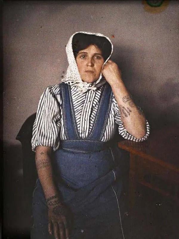 Una donna con le braccia tatuate posa in Bosnia, 1912. (Museo Albert Kahn.).