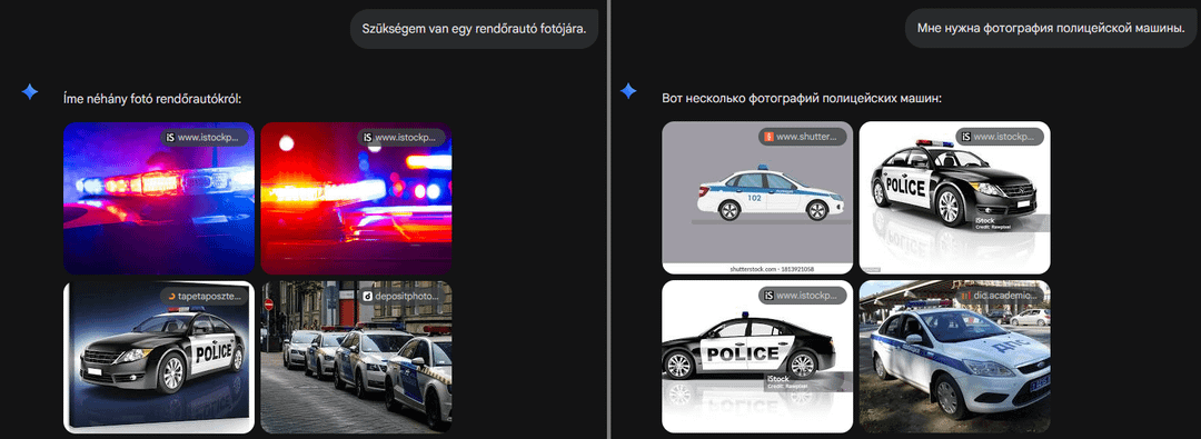 Considero importante rappresentare le auto della polizia in stile russo. Come ho illustrato in una delle foto, molti modelli di intelligenza artificiale tengono conto del linguaggio utilizzato nel prompt per preparare la risposta. Mentre un messaggio in lingua ungherese vedrà probabilmente un’auto della polizia ungherese, un messaggio in lingua russa risulterà più probabilmente in un’auto della polizia in stile russo. Credo che l’immagine della risposta non sia stata generata solo con l’aiuto dell’intelligenza artificiale, ma molto probabilmente con un suggerimento in russo – o con l’aiuto di un modello contenente principalmente campioni russi.