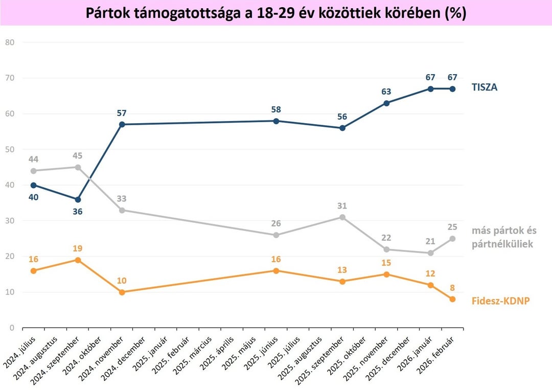 Ho raccolto i dati dei sondaggi d’opinione nazionali di Median pubblicati su HVG per gruppo demografico, pubblicati a partire dalle elezioni europee del 2024.