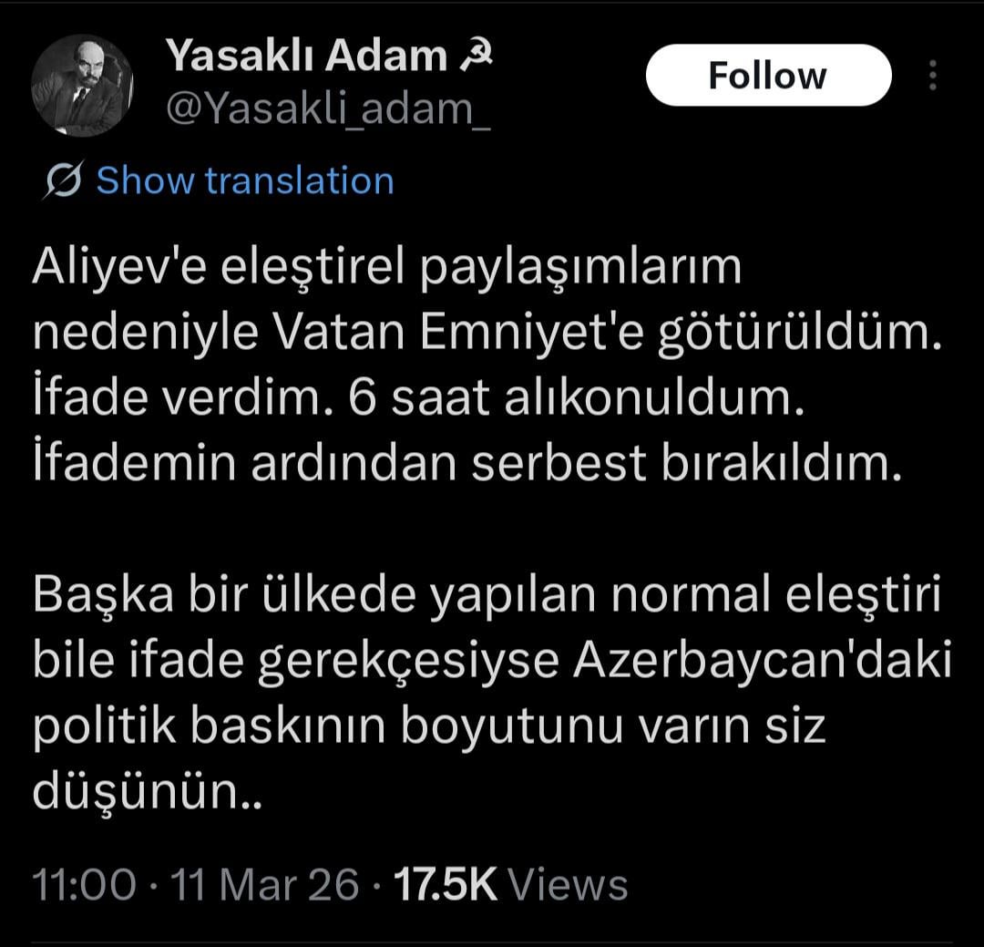 Non solo in Azerbaigian, ma anche all’estero, anche come cittadino straniero sei sotto pressione per criticare Aliyev. Non per niente siamo un Paese fraterno