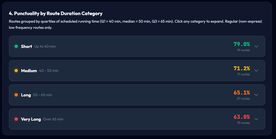La ricerca rapida del percorso in linea con il post recente sulla rimozione di alcune fermate. I percorsi che coprono lunghe distanze ma saltano la maggior parte delle fermate ottengono buoni risultati, con una puntualità pari a circa l’81%. Sono le fermate, non la distanza, ad aggravare i ritardi.