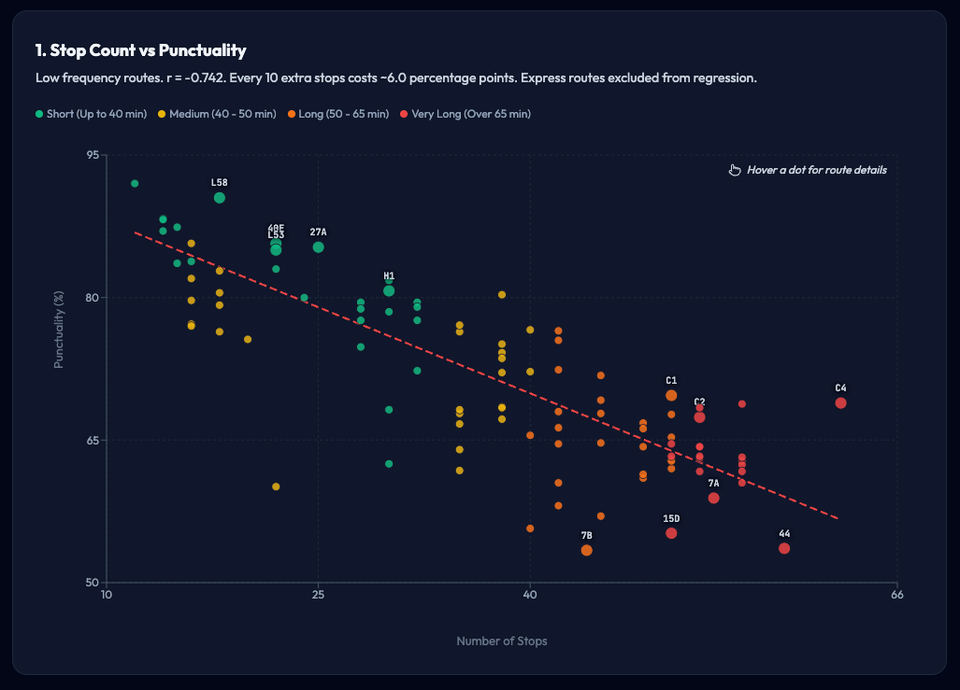 Me lo chiedo sempre mentre sono sull’autobus, quindi durante questo fine settimana ho provato a navigare con l’intelligenza artificiale attraverso alcuni dati sulle prestazioni dell’NTA (2023-2025) per vedere se i percorsi più lunghi sono davvero meno affidabili. Si scopre che lo sono, di molto.