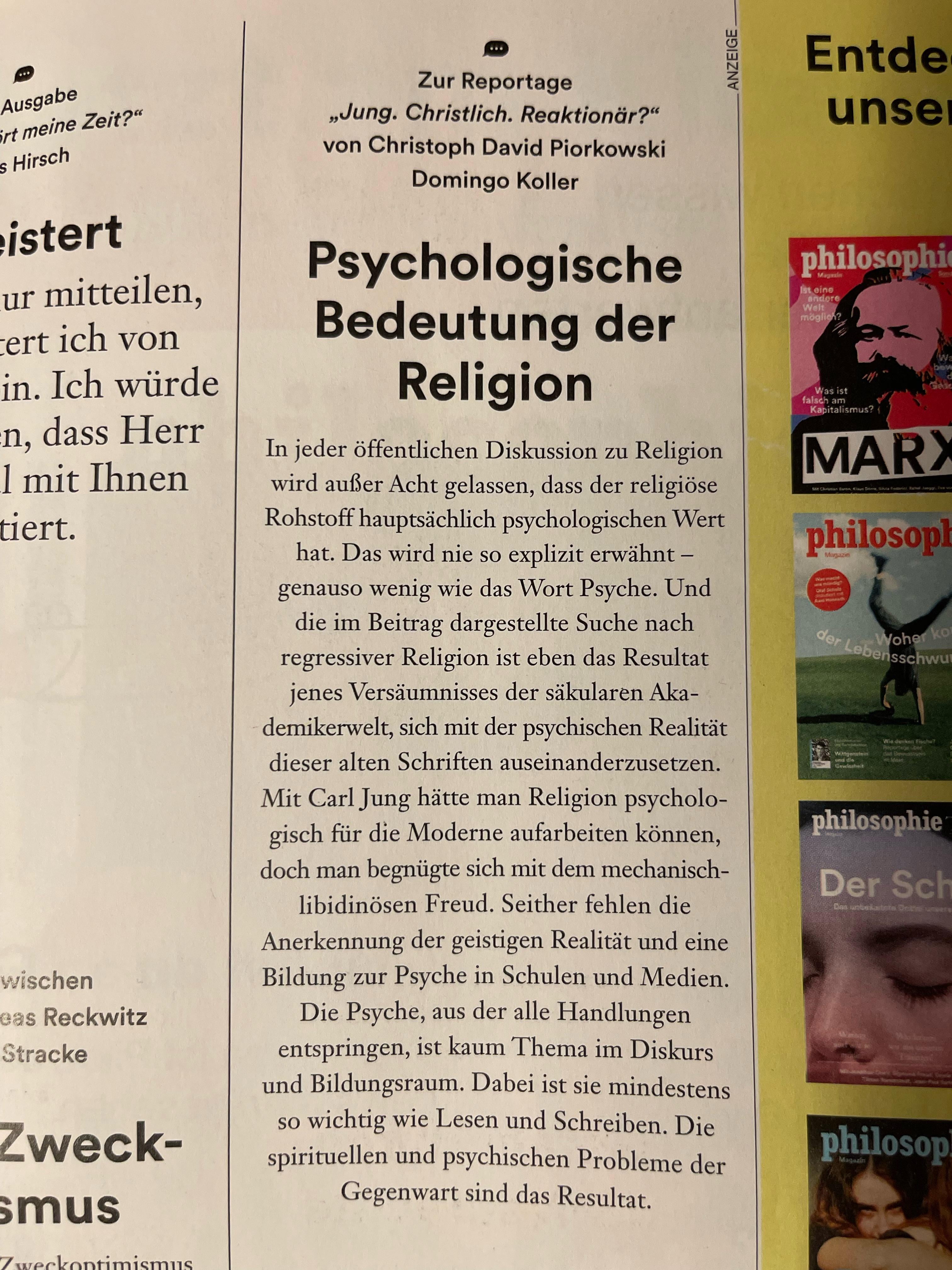 Mi sono imbattuto in questo nelle lettere all’editore della rivista philosophie e l’ho trovato abbastanza ovvio. Non è certo un problema, ma c’è molto da fare a riguardo. La psicologia non è un argomento nelle scuole primarie, ma l’educazione religiosa polverosa è comune. Se il mondo non fosse completamente diverso, tutti avrebbero a che fare con la psicologia oltre che con le basi della matematica? E in qualche modo senti parlare sempre e solo di Freud. Qualcuno ha letto Jung e può spiegarmi cosa intende?