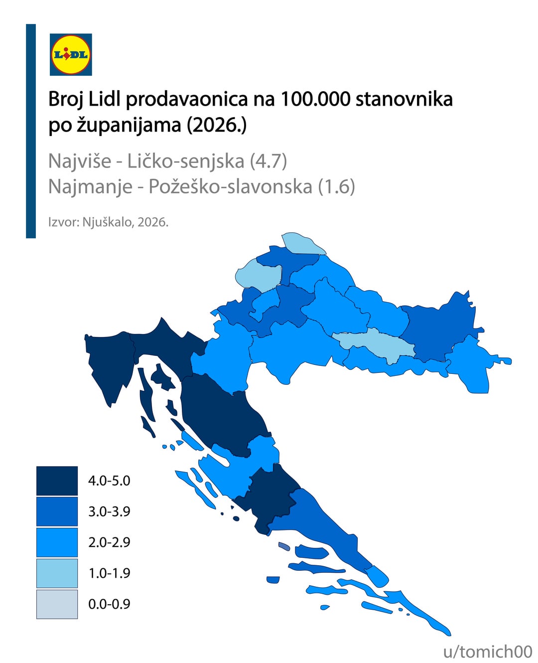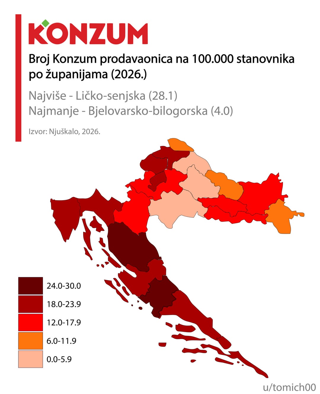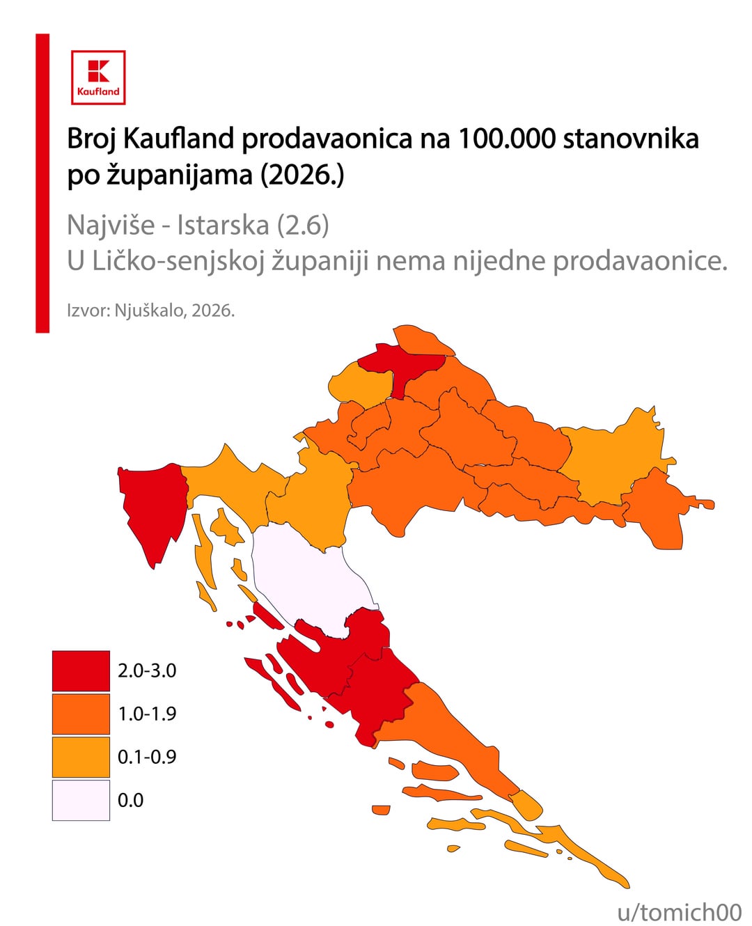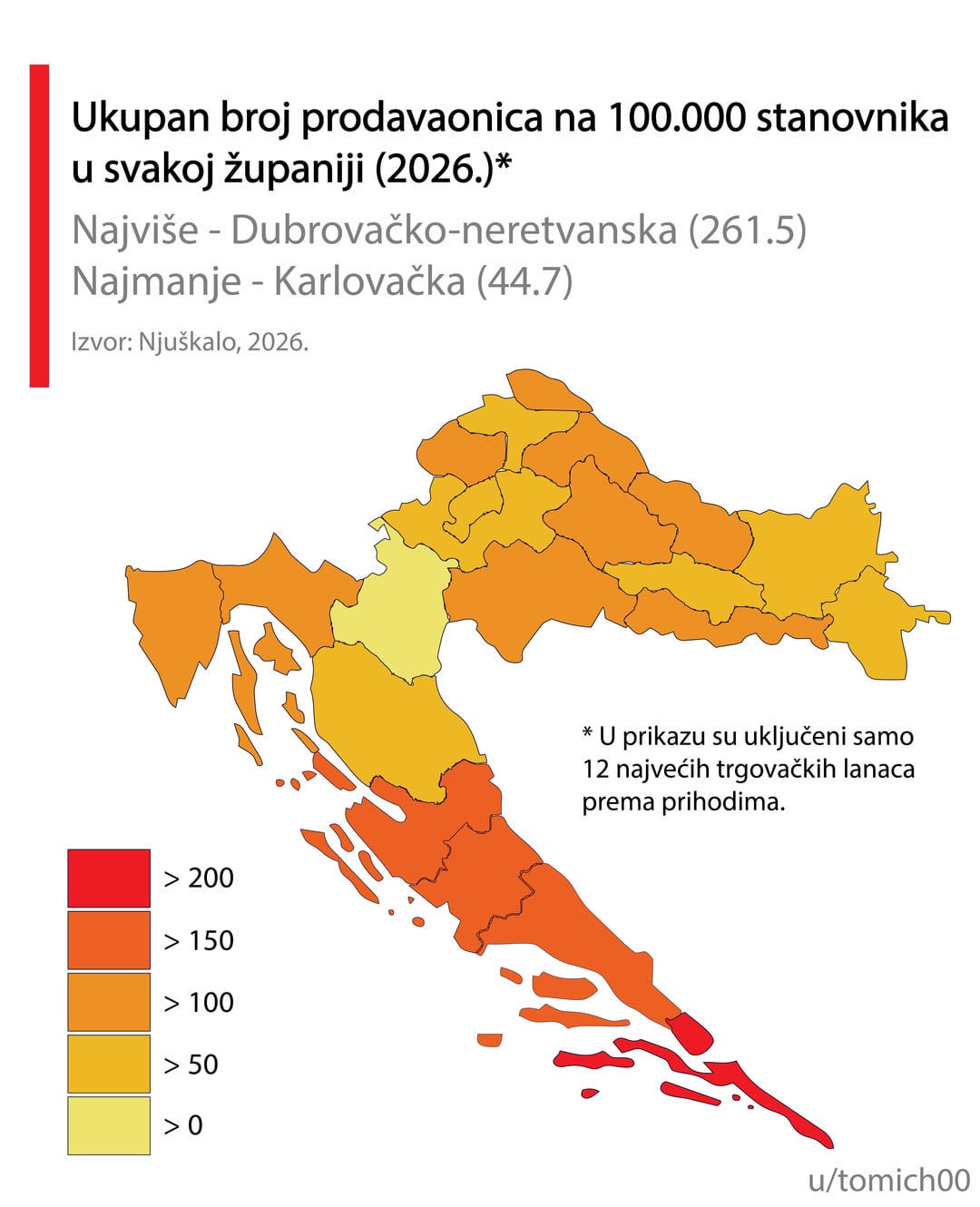 Mislim da informacija može i treba biti biti puno bolja. Računanje po broju stanovnika grupirano po županijama je pogrešno, Ličko-Senjska je pobjednik za Konzum, Lidl, itd, zašto, zato što ima jedan dućan u Gospiću i jedan u Senju, a u županiji živi 127 ljudi. Razumijem namjeru, ali mislim da ipak priča krivu priču.