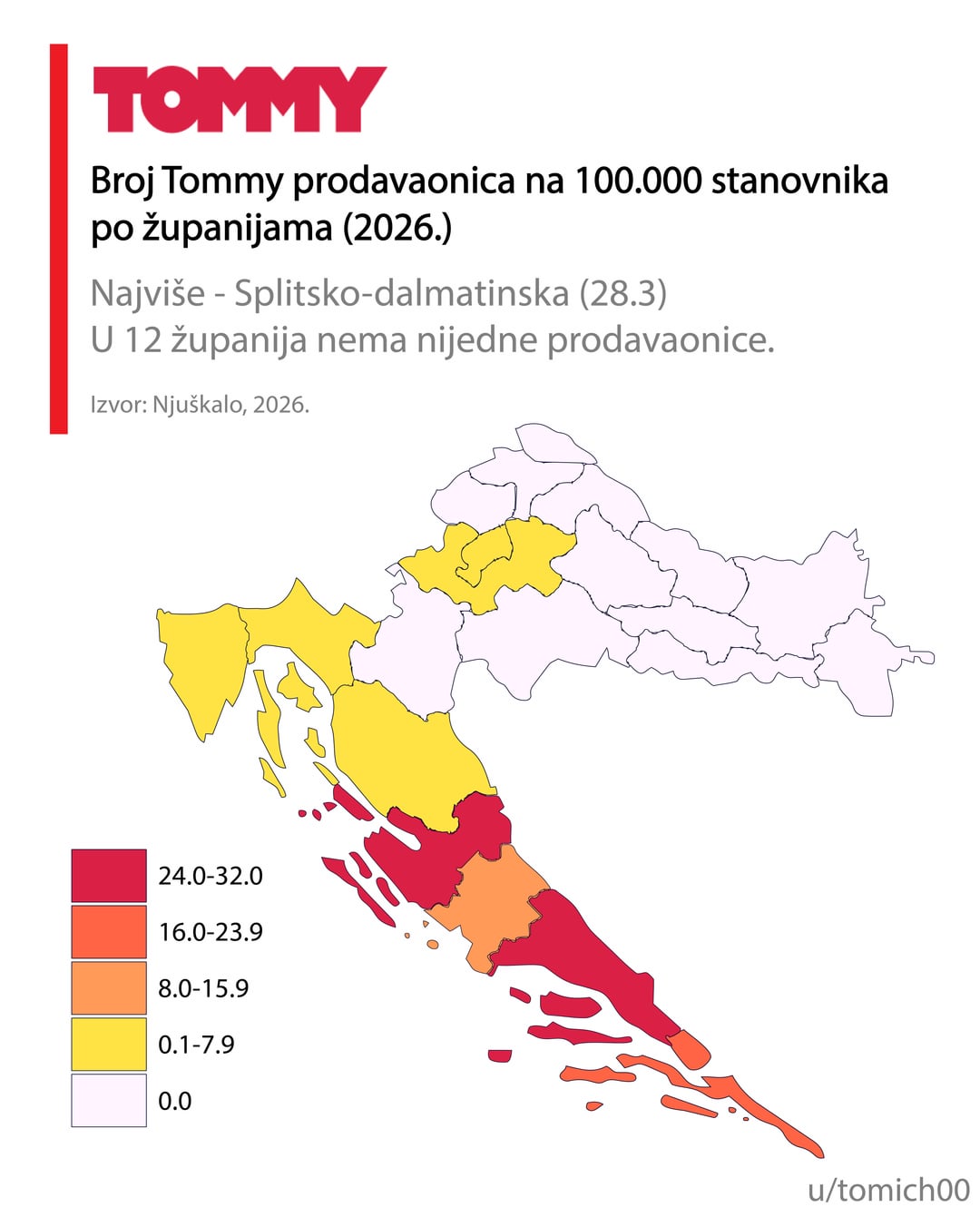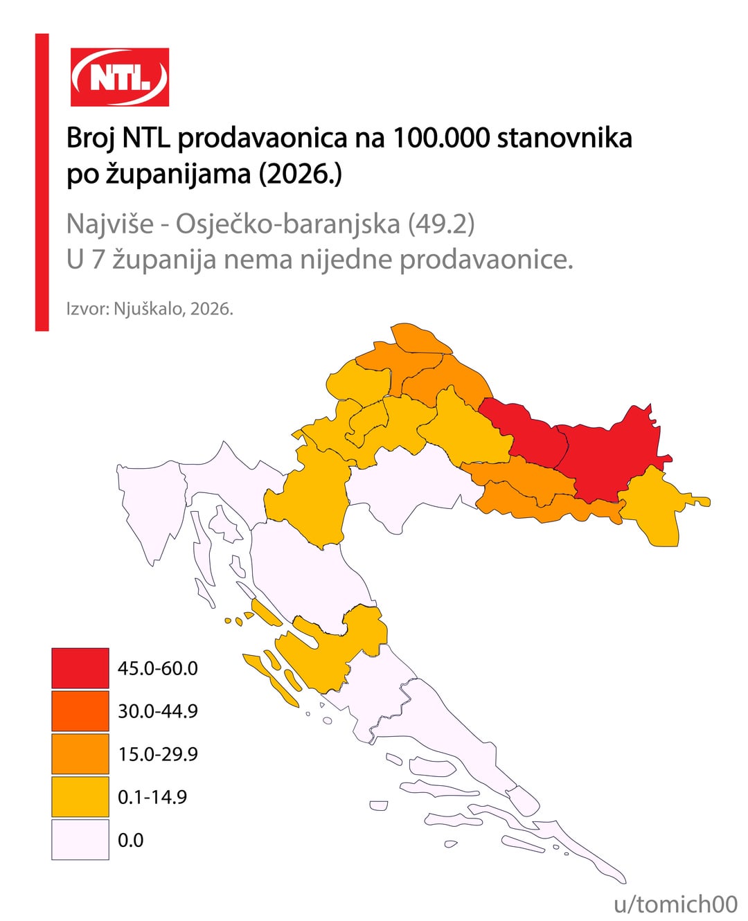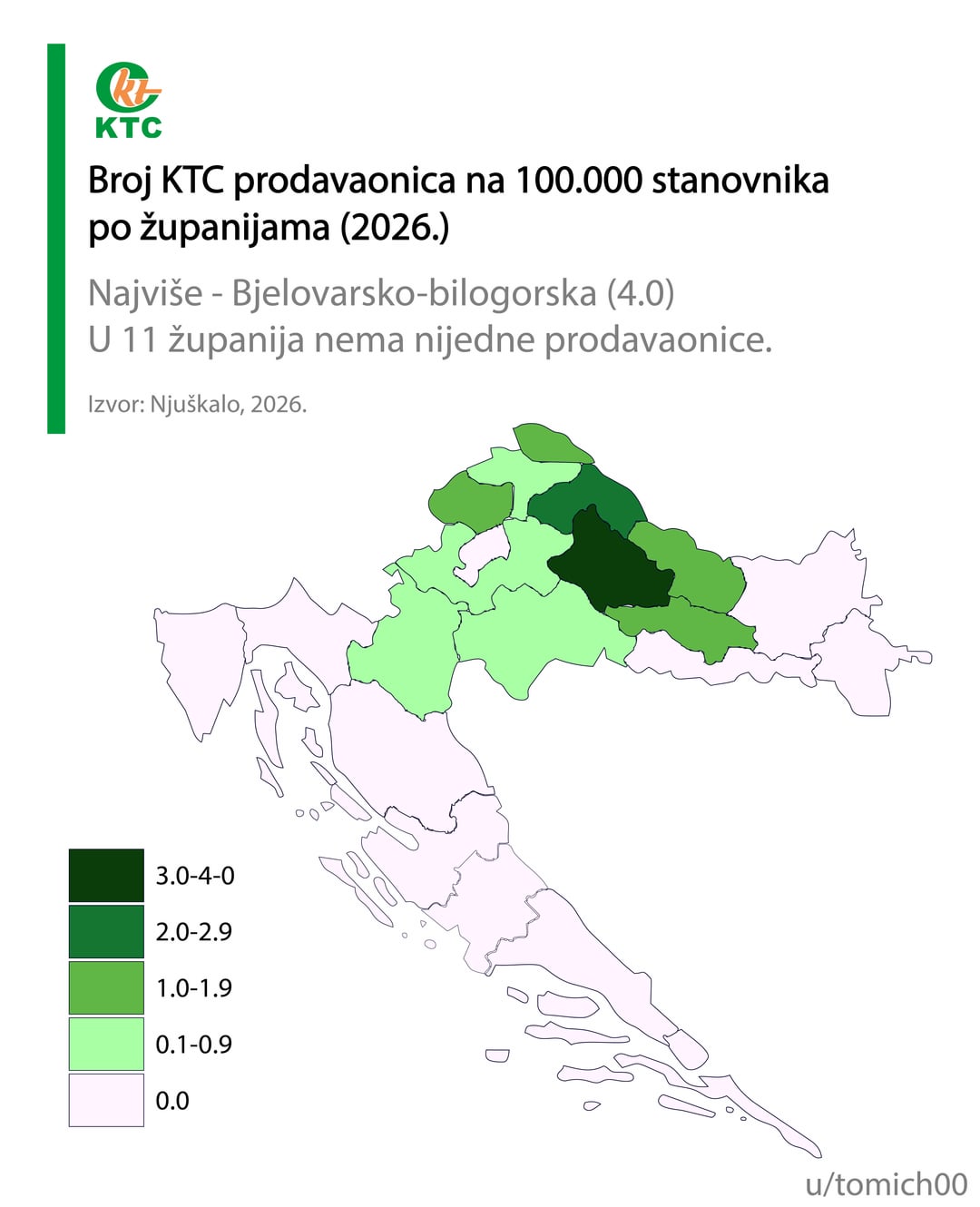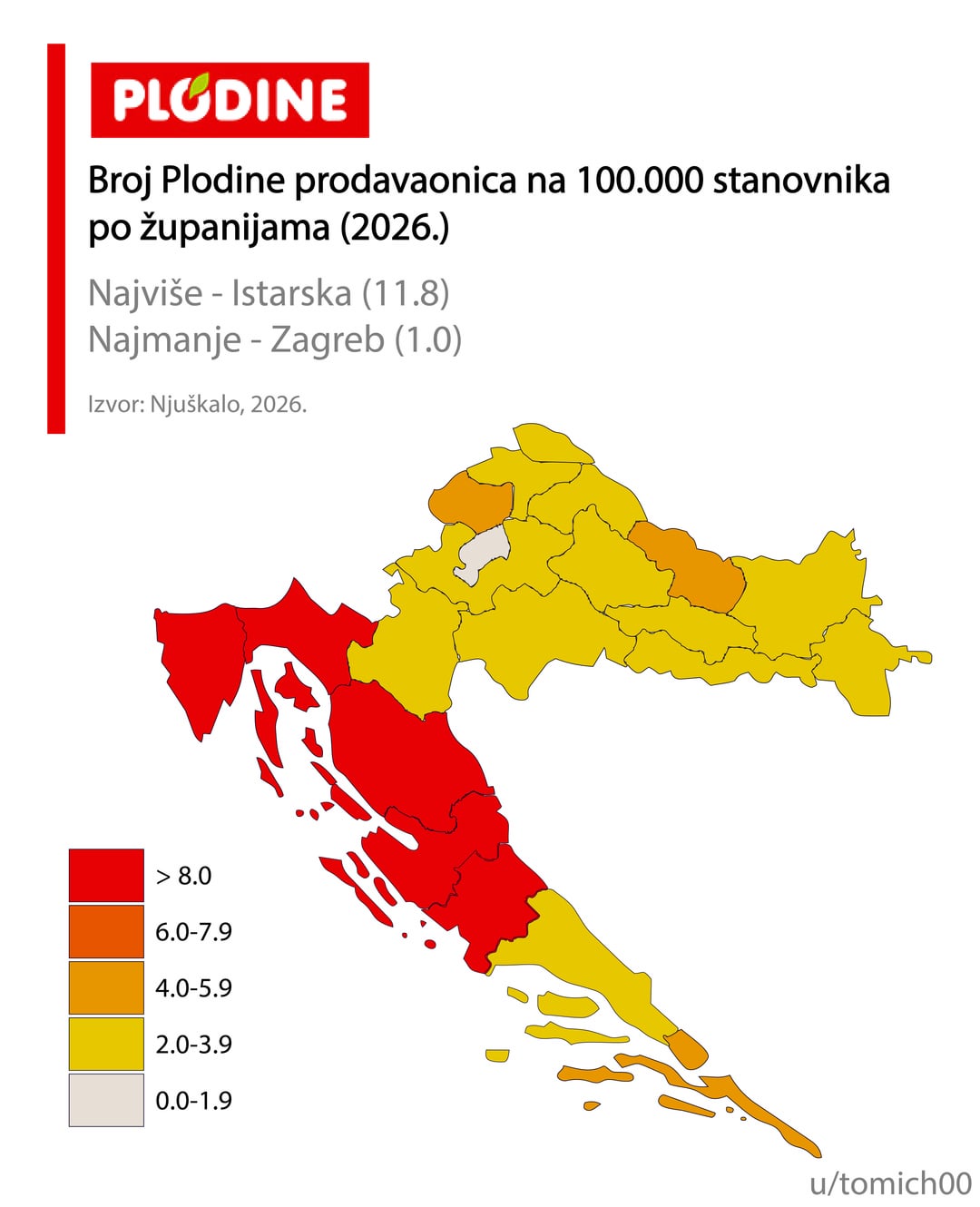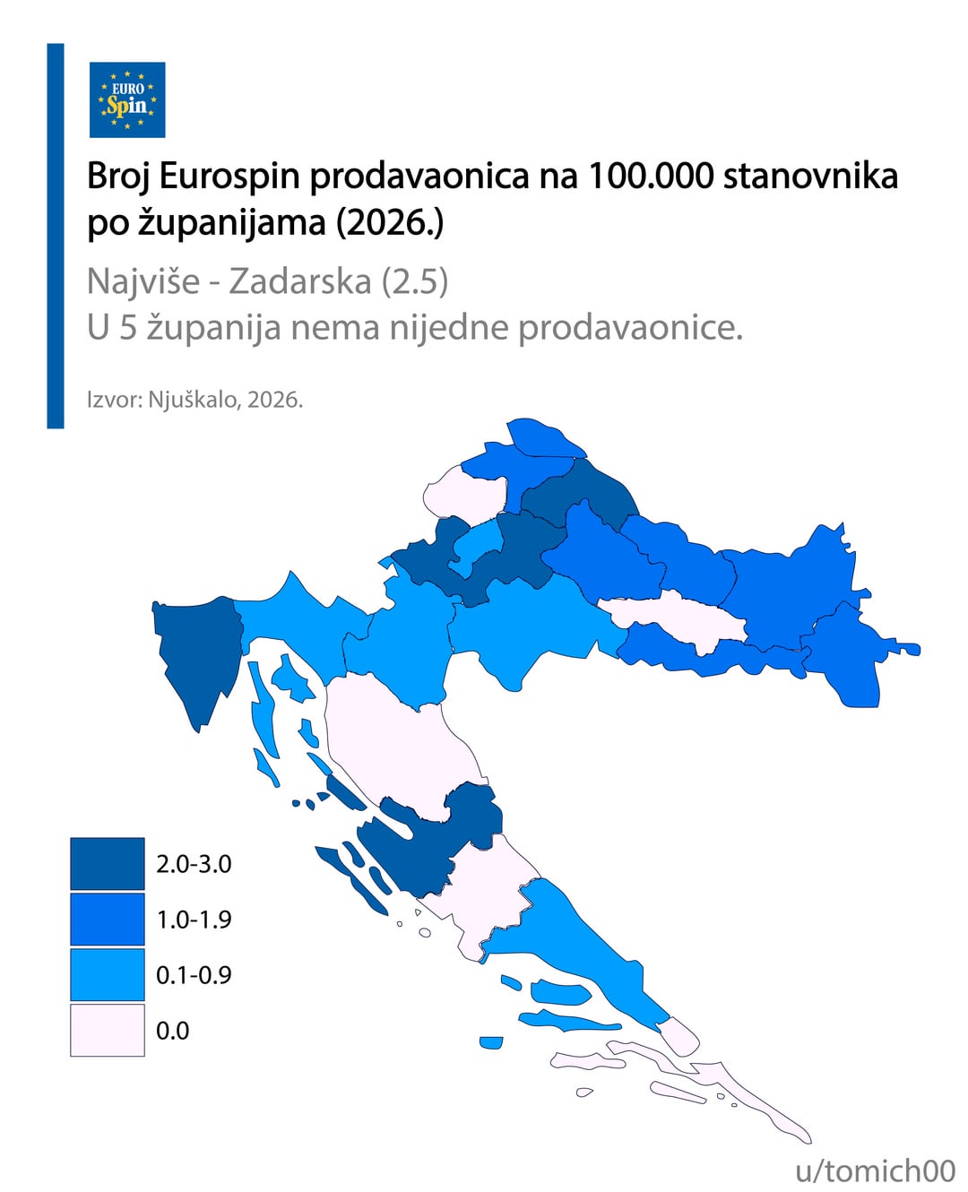 Mislim da informacija može i treba biti biti puno bolja. Računanje po broju stanovnika grupirano po županijama je pogrešno, Ličko-Senjska je pobjednik za Konzum, Lidl, itd, zašto, zato što ima jedan dućan u Gospiću i jedan u Senju, a u županiji živi 127 ljudi. Razumijem namjeru, ali mislim da ipak priča krivu priču.