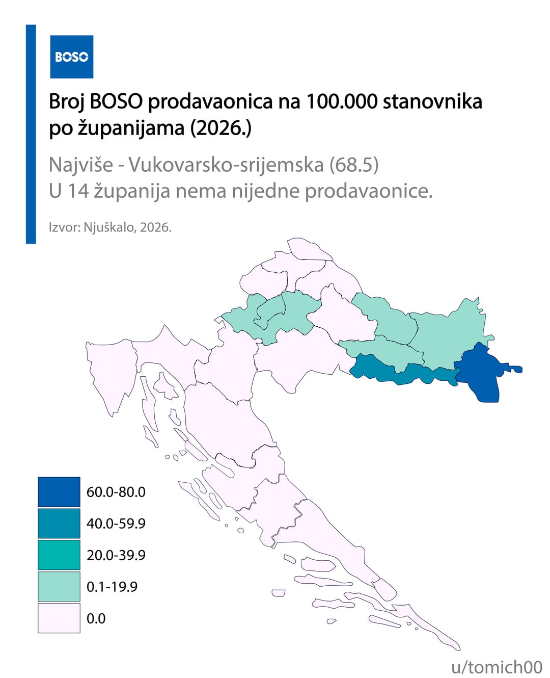 Dodatno, bilo bi fora da su skale uniformirane. Npr, 4 Lidla je jednako tamno kao 30 Konzuma. Što nas dovodi do kvadrata prodajnog prostora, što bi bilo bolje mjerilo. Dakle koliko kvadrata prodajnog prostora ima koji lanac u kojoj županiji. Različita boja po lancima, ali skala je jednaka. 40k kvadrata Lidla naprema 100k kvadrata Konzuma itd.