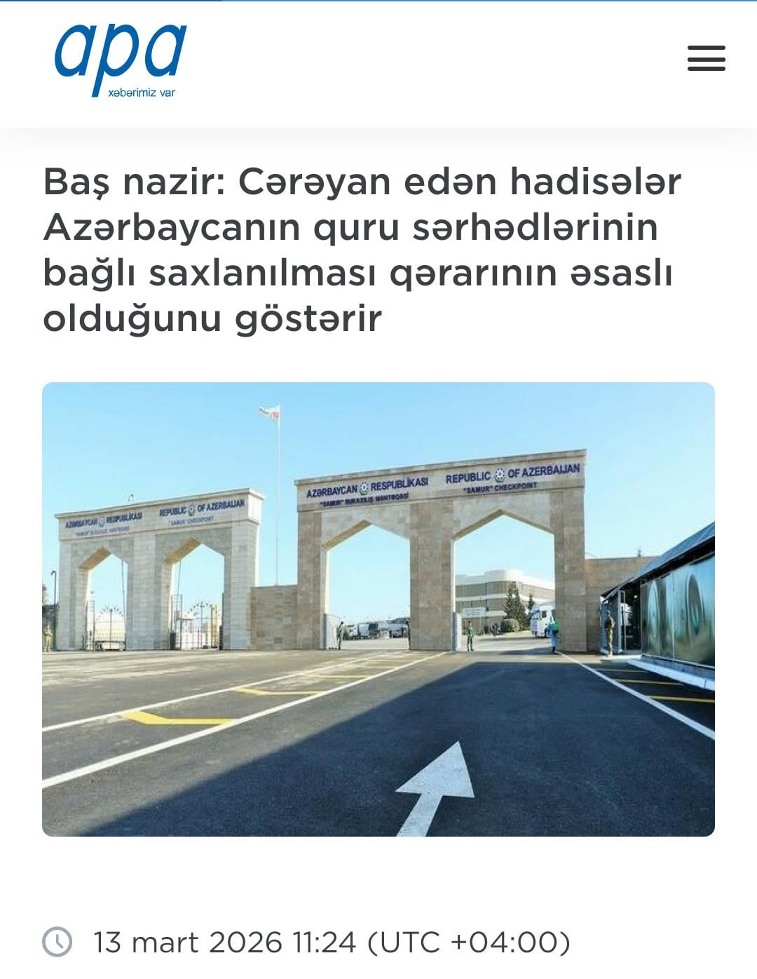 *“Son dövrdə regionda cərəyan edən hadisələr Azərbaycanın quru sərhədlərinin bağlı saxlanılması qərarının nə qədər əsaslı və zəruri olduğunu göstərir, eyni zamanda, bu, cənab Prezidentin uzaqgörən və müdrik dövlətçilik siyasətinin növbəti təsdiqidir”, – Baş nazir vurğulayıb.*