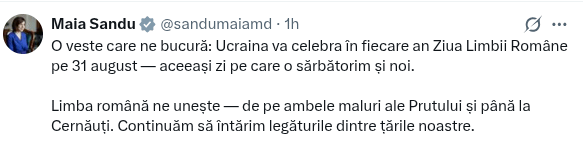 Maia Sandu – Una notizia che ci rende felici: l’Ucraina celebrerà la Giornata della lingua rumena ogni anno il 31 agosto, lo stesso giorno in cui festeggiamo noi. La lingua rumena ci unisce da entrambe le sponde del Prut a Chernivtsi. Continuiamo a rafforzare i legami tra i nostri paesi.