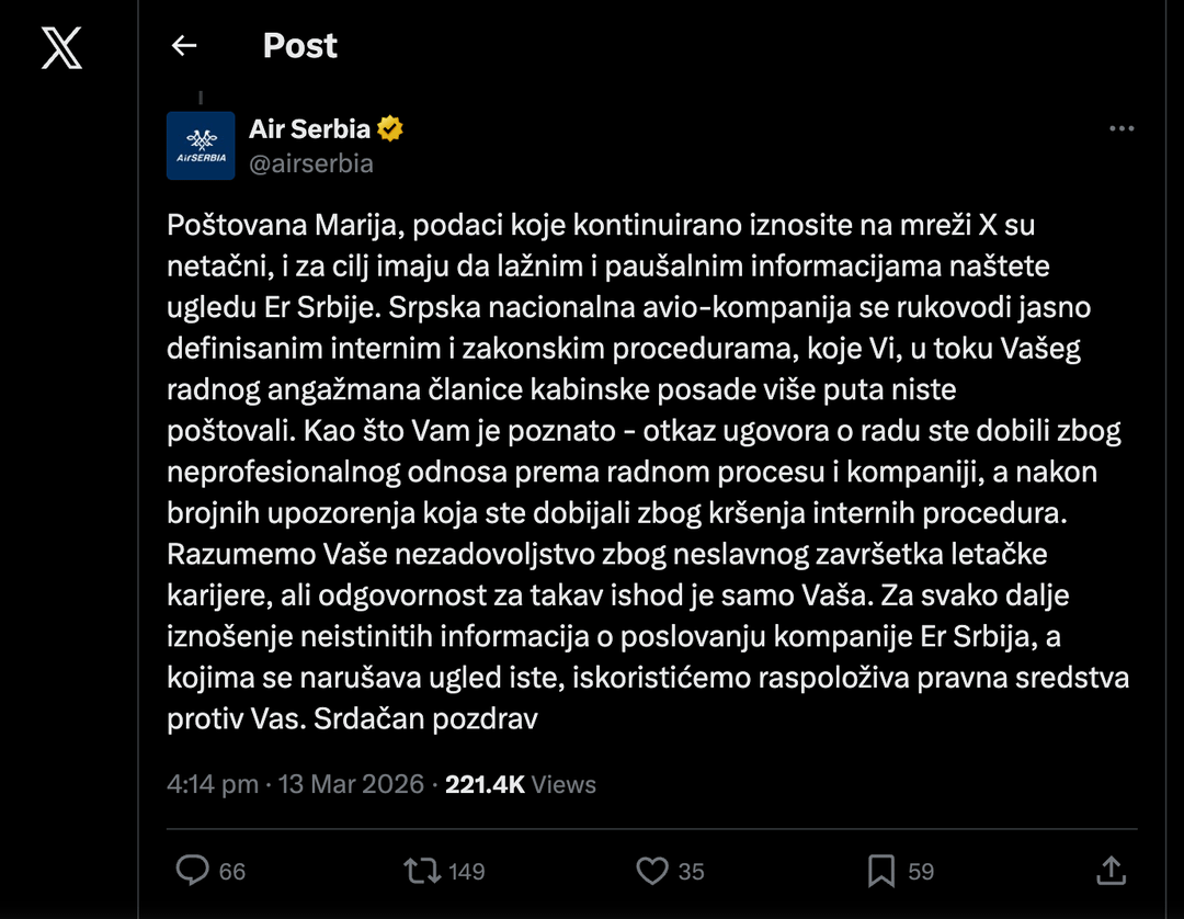 Ako je zaista neistina to o čemu priča, mislim da je odgovor AirSerbije sastim korektan
