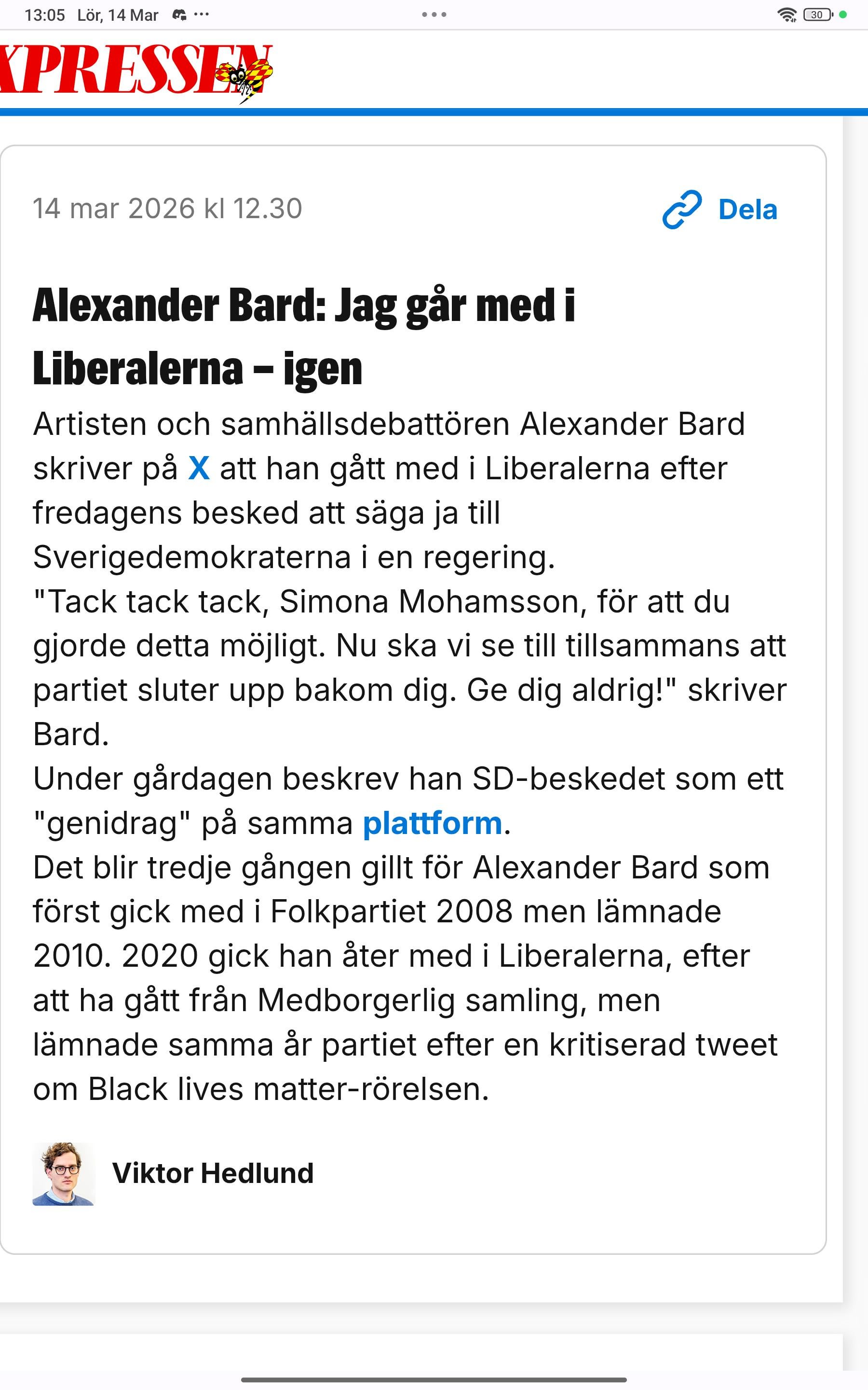 italrose on 14/03/2026 12:10 Ah! Liberalerna får stöd av den enligt egen utsago högerextrema Marxisten, Alexander Bard. Visste inte att deras politiska visioner linjerade så väl. Får Liberalerna pengar från utländska makter för att göra ett skämt av svensk politik?