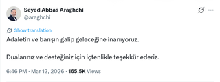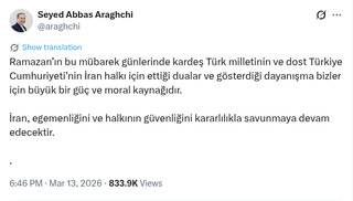 Le preghiere e la solidarietà mostrate dalla fraterna nazione turca e dall’amica Repubblica di Türkiye per il popolo iraniano in questi giorni sacri del Ramadan sono per noi una grande fonte di forza e morale.