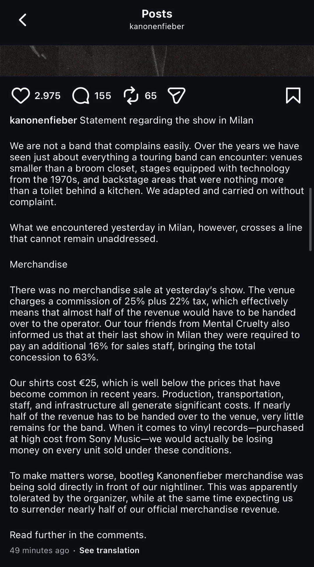 Non c’è stata alcuna vendita di merchandise al concerto di ieri. La venue applica una commissione del 25% più il 22% di tasse, il che significa in pratica che quasi la metà del ricavato avrebbe dovuto essere consegnata all’operatore. I nostri amici in tour dei Mental Cruelty ci hanno inoltre informato che al loro ultimo concerto a Milano sono stati costretti a pagare un ulteriore 16% per il personale addetto alle vendite, portando la concessione totale al 63%.