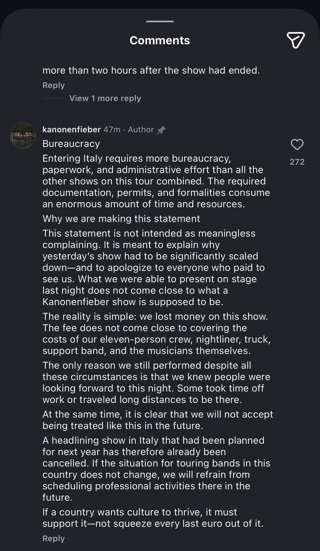 Un concerto headliner in Italia che era stato pianificato per l’anno prossimo è quindi già stato cancellato. Se la situazione per le band in tour in questo paese non cambia, ci asterremo dallo svolgere attività professionali lì in futuro.