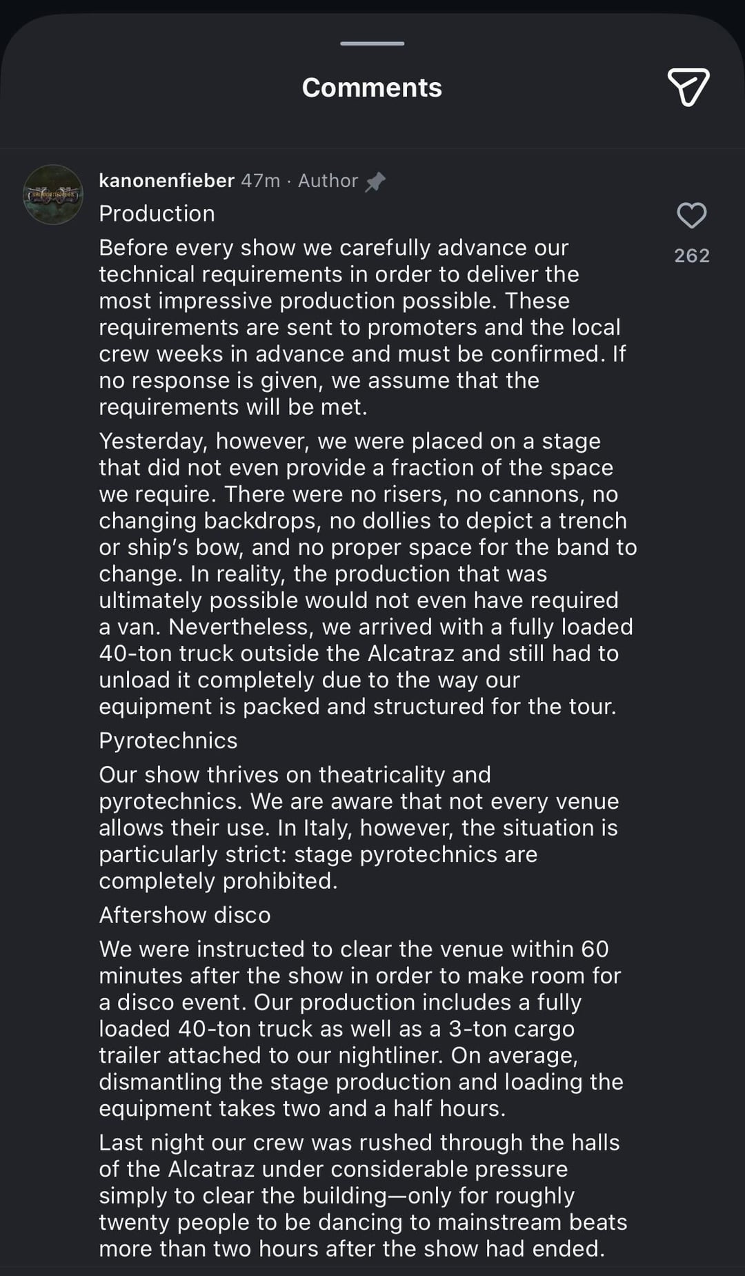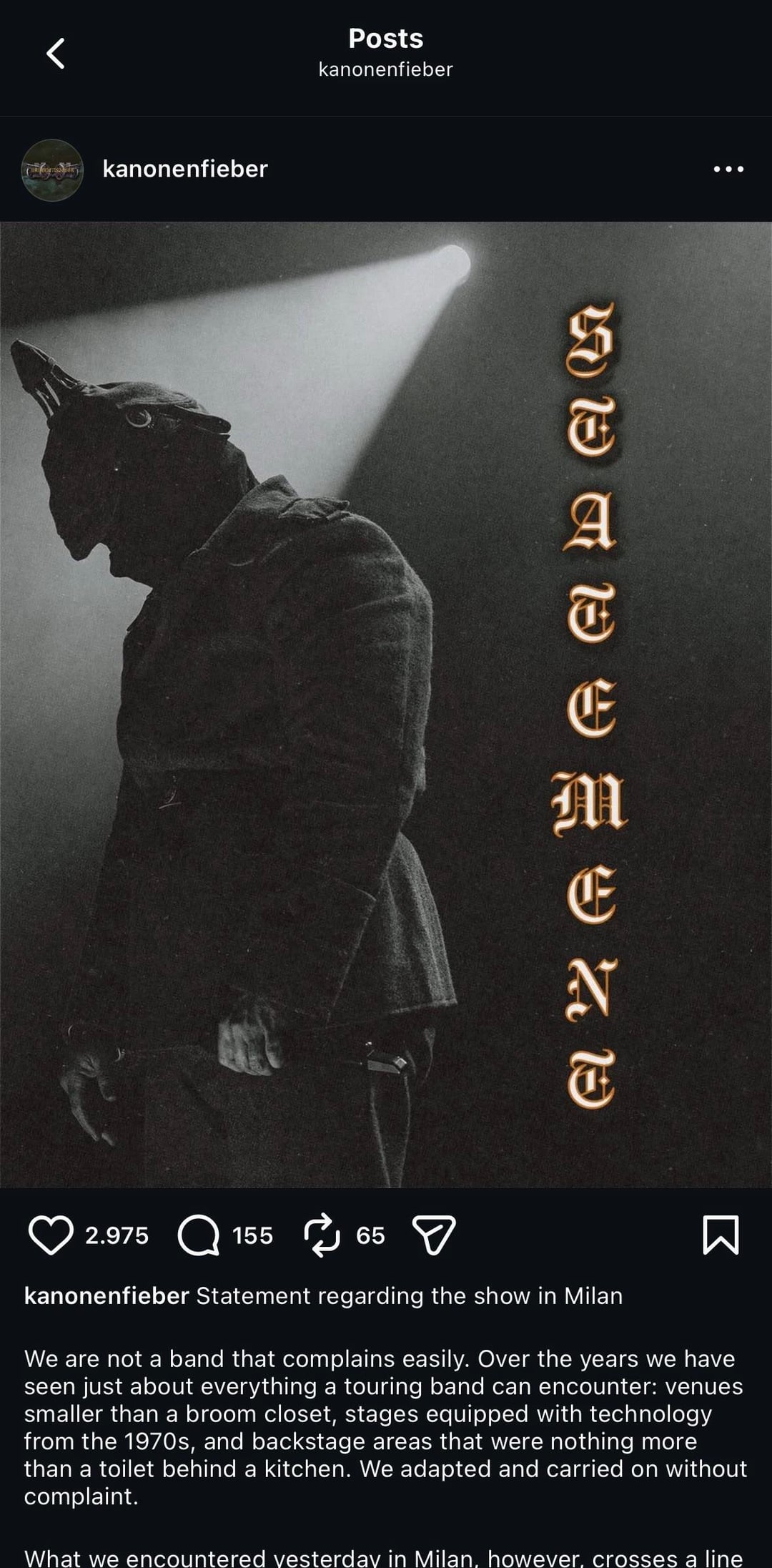 Questo statement non è inteso come una lamentela fine a sé stessa. È pensato per spiegare perché il concerto di ieri ha dovuto essere ridimensionato in modo significativo — e per scusarci con tutti coloro che hanno pagato per vederci. Quello che siamo riusciti a presentare sul palco ieri sera non si avvicina lontanamente a quello che uno show di Kanonenfieber dovrebbe essere.