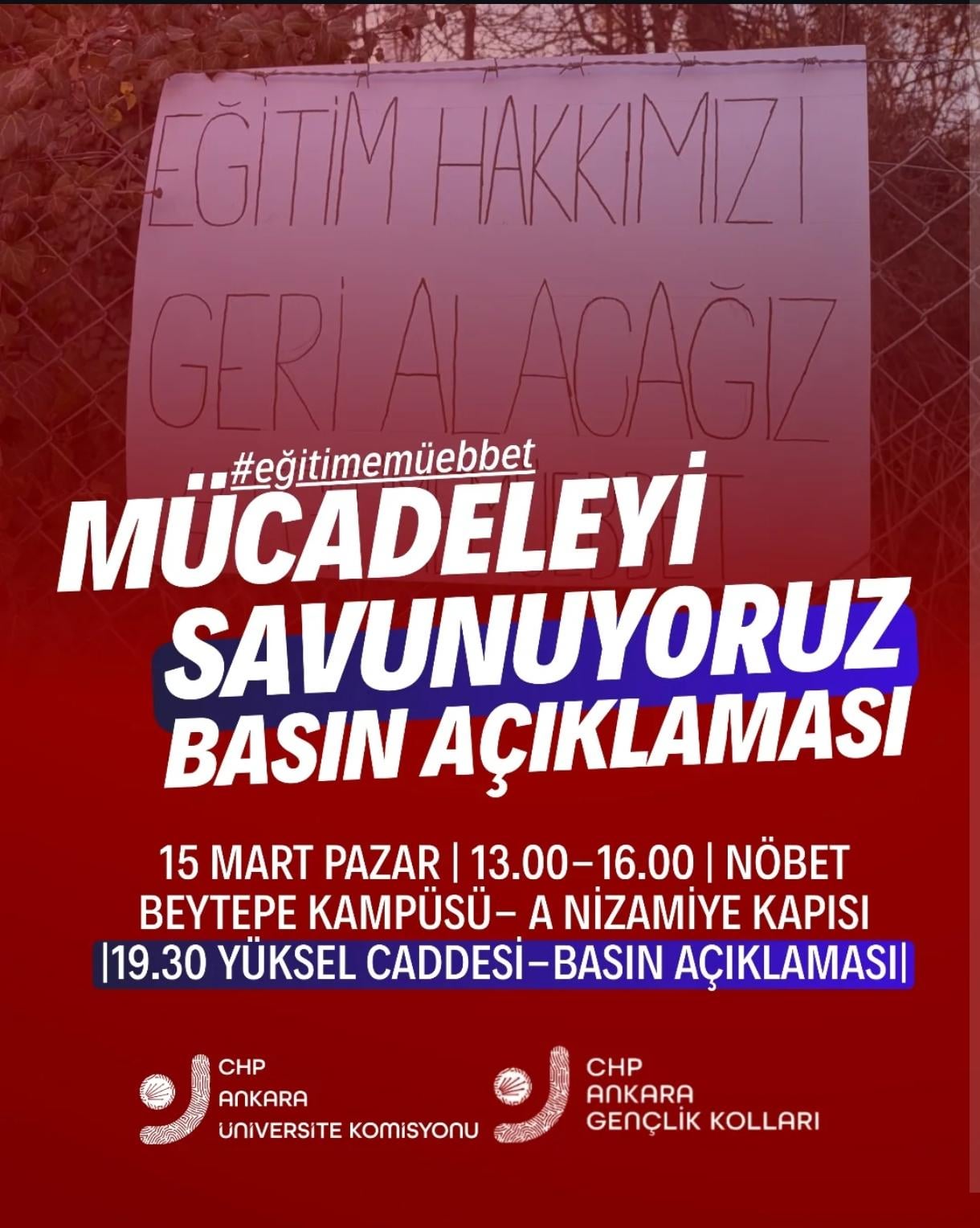 Günlerdir devam eden bu direniş nöbeti tek bir siyasi partinin değil, Hacettepe öğrencilerinin ve onlara destek veren örgütlerin ortak çabasıdır. CHP olarak biz de bu direnişe omuz veriyoruz, tüm Ankara halkını da Hacettepe öğrencileri ile dayanışmaya davet ediyoruz.