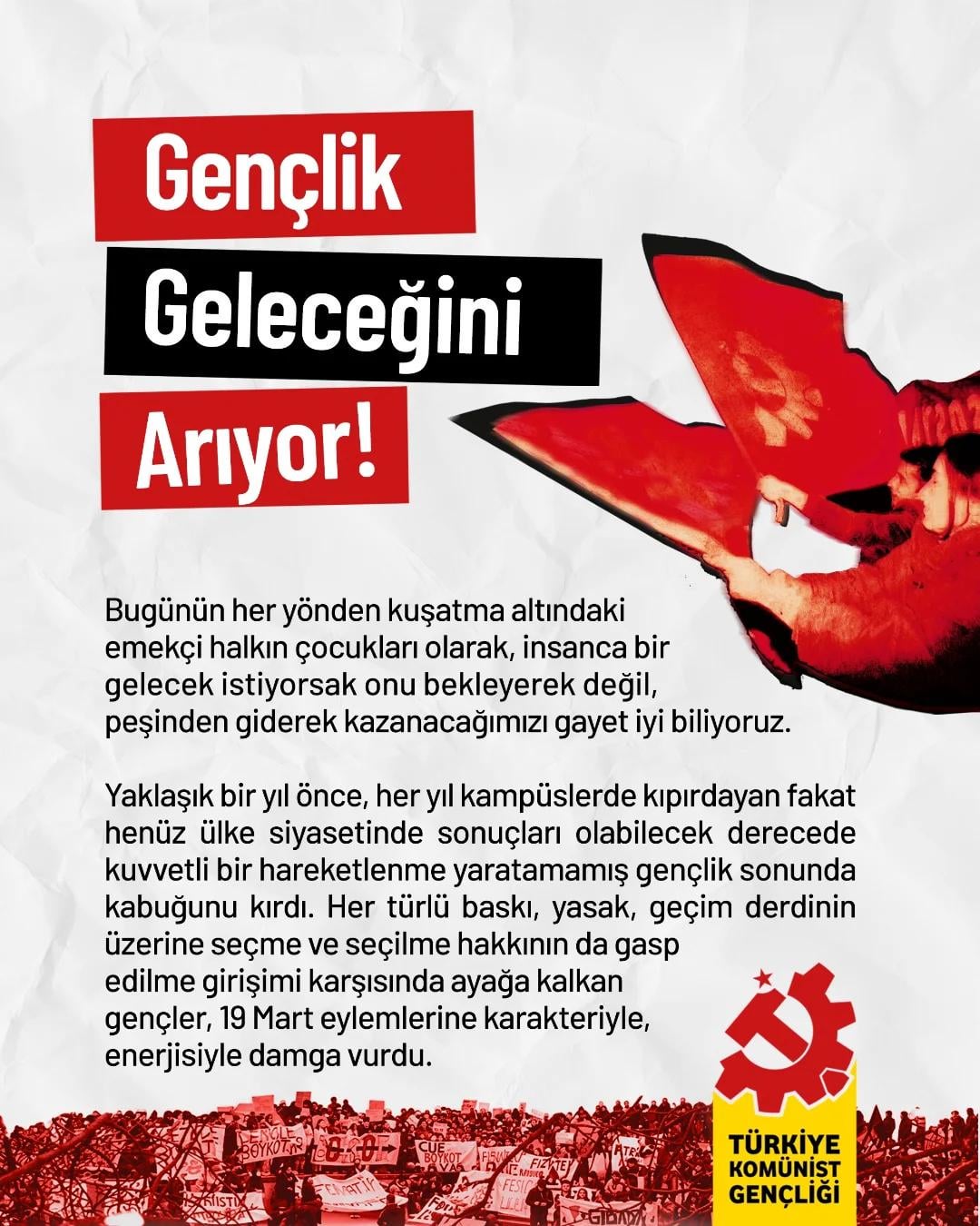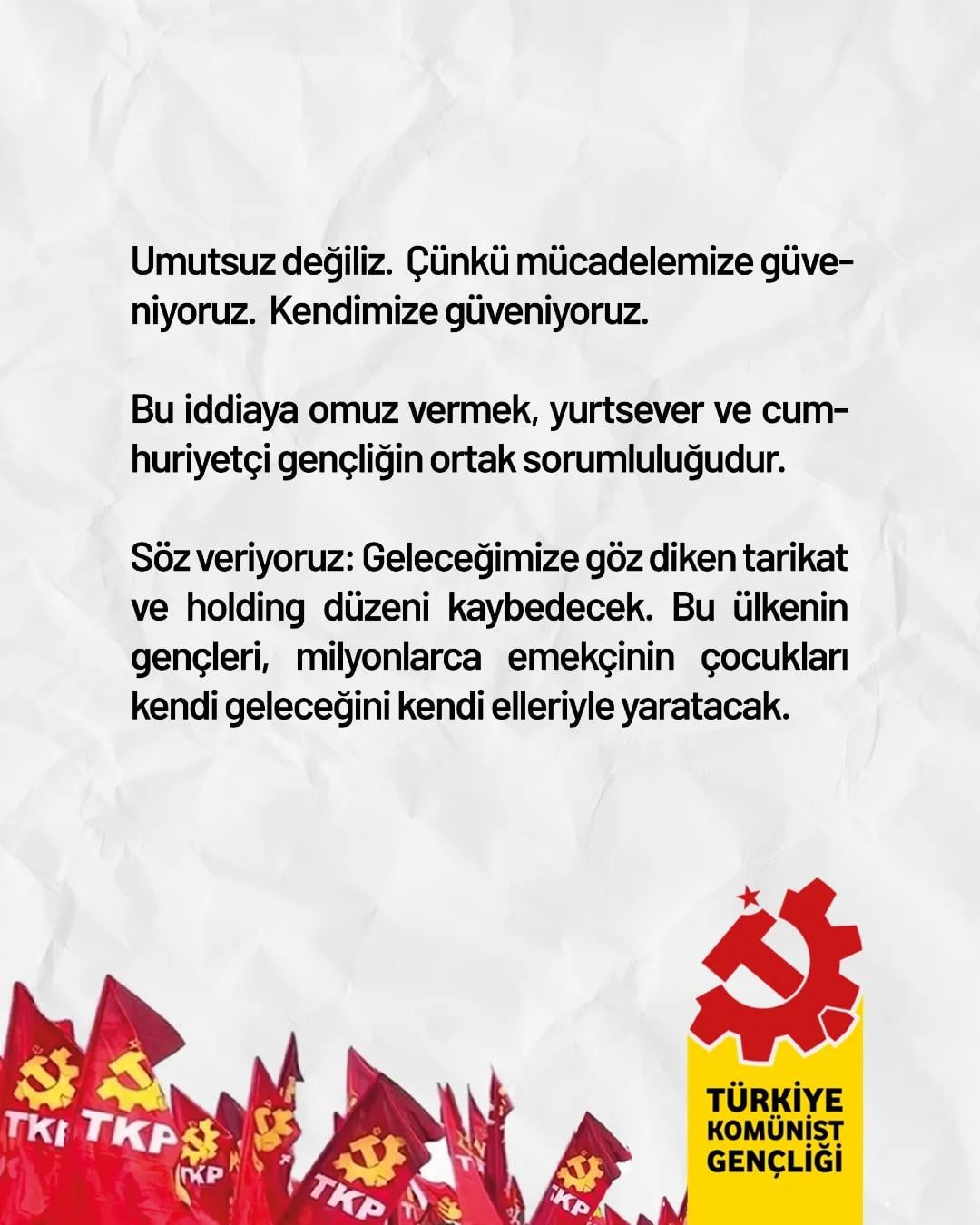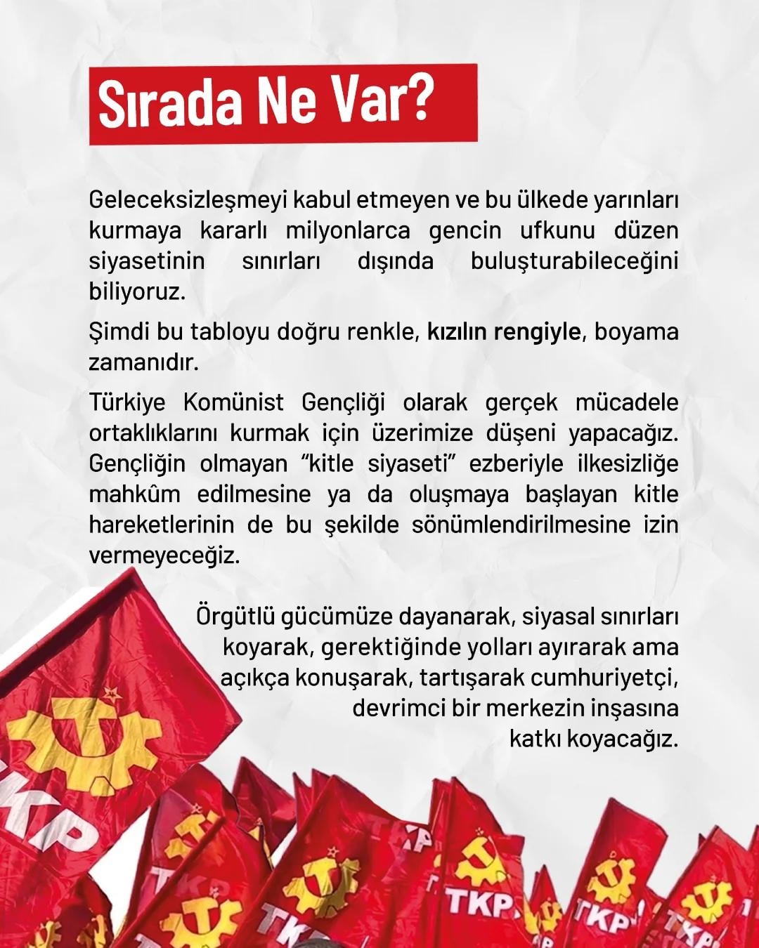 Come Gioventù Comunista di Türkiye, faremo la nostra parte per stabilire veri partenariati di lotta. Non permetteremo che i giovani siano condannati alla mancanza di principi memorizzando una “politica di massa” inesistente o che smorzino i movimenti di massa che cominciano a formarsi in questo modo. Facendo affidamento sul nostro potere organizzato, contribuiremo alla costruzione di un centro repubblicano e rivoluzionario stabilendo confini politici, separando le strade quando necessario, ma parlando e discutendo apertamente.