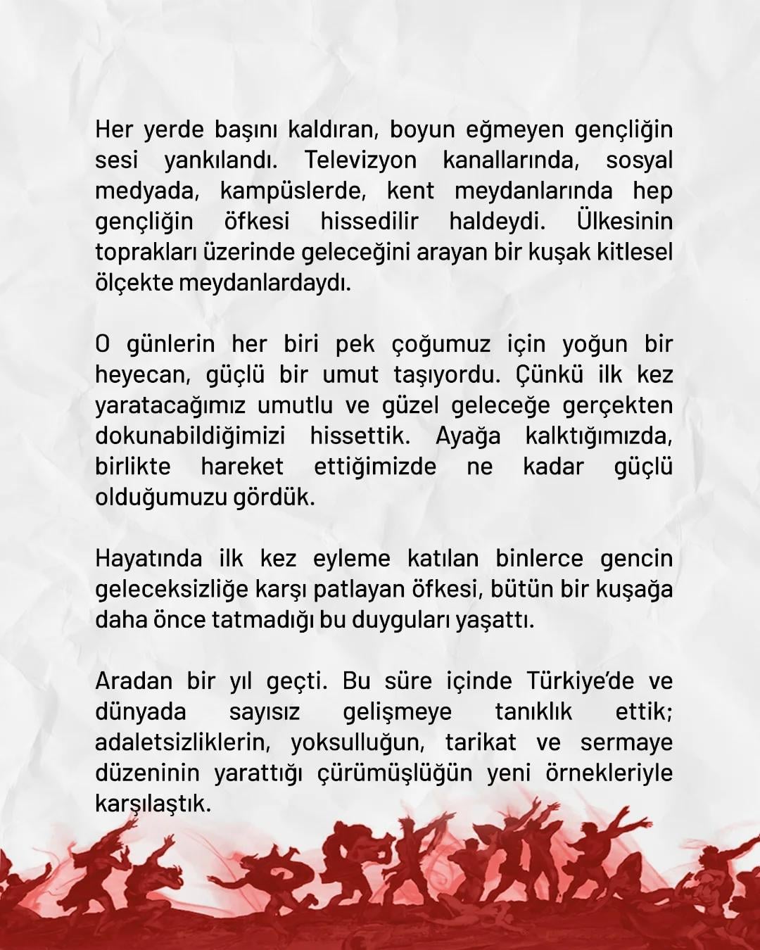 Circa un anno fa, i giovani, che ogni anno erano attivi nei campus ma non erano ancora riusciti a creare un movimento forte che potesse avere conseguenze nella politica del paese, sono finalmente usciti dal loro guscio. I giovani che si sono opposti a ogni tipo di oppressione, divieto e tentativo di usurpare il loro diritto di voto e di essere eletti, oltre alle loro difficoltà di sostentamento, hanno lasciato il segno nelle proteste del 19 marzo con il loro carattere e la loro energia.