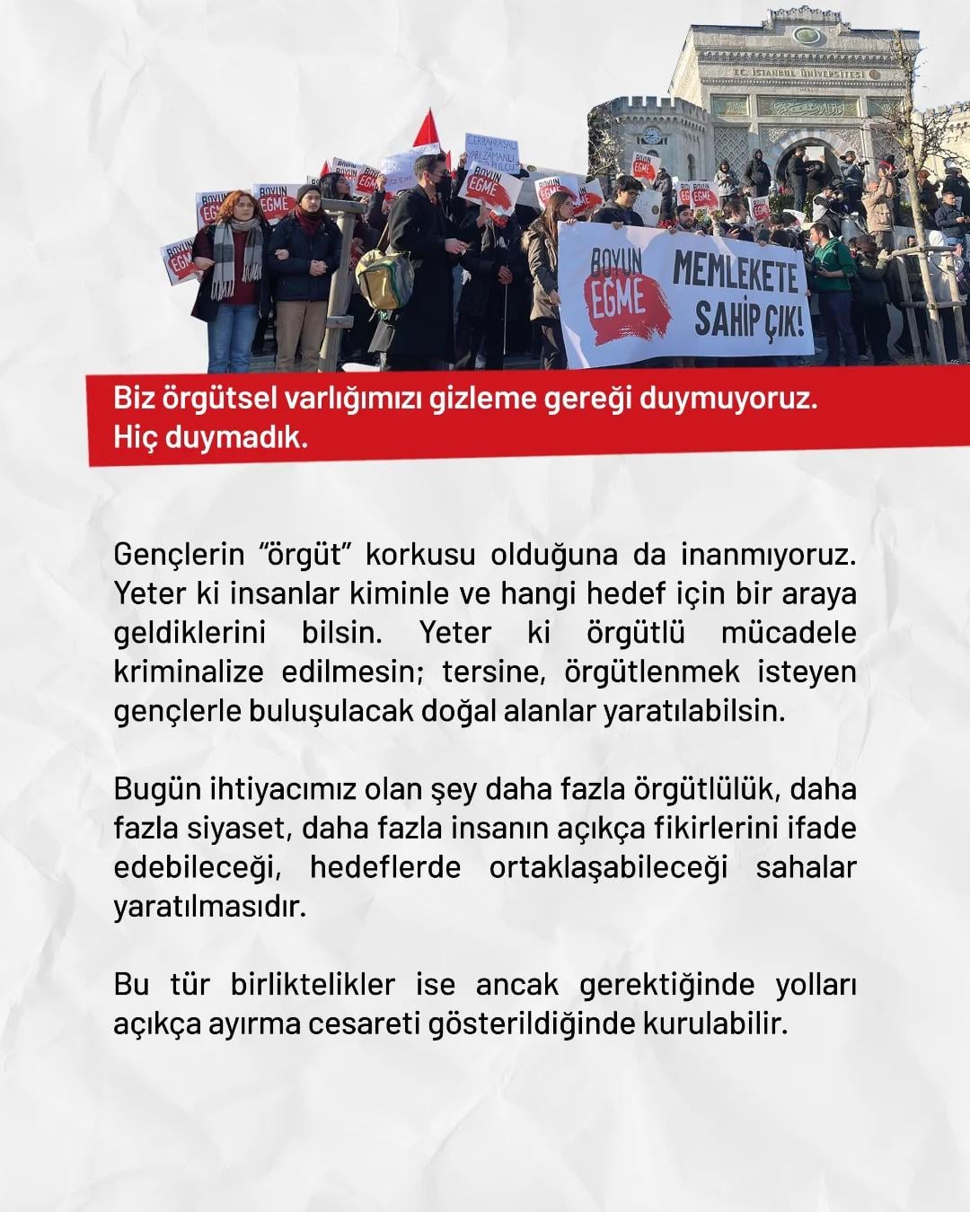 Ogni persona che vuole combattere ha il diritto di sapere con chi e per quale scopo si schiera. Il contrario non crea fiducia; Al contrario, distrae le persone dalla lotta comune. Non sentiamo il bisogno di nascondere la nostra esistenza organizzativa. Non ne abbiamo mai sentito parlare. Non crediamo che i giovani abbiano paura dell'”organizzazione”. A patto che le persone sappiano con chi si stanno unendo e per quale scopo. Finché la lotta organizzata non viene criminalizzata; Al contrario, dovrebbero essere creati spazi naturali per incontrare i giovani che hanno voglia di organizzarsi.
