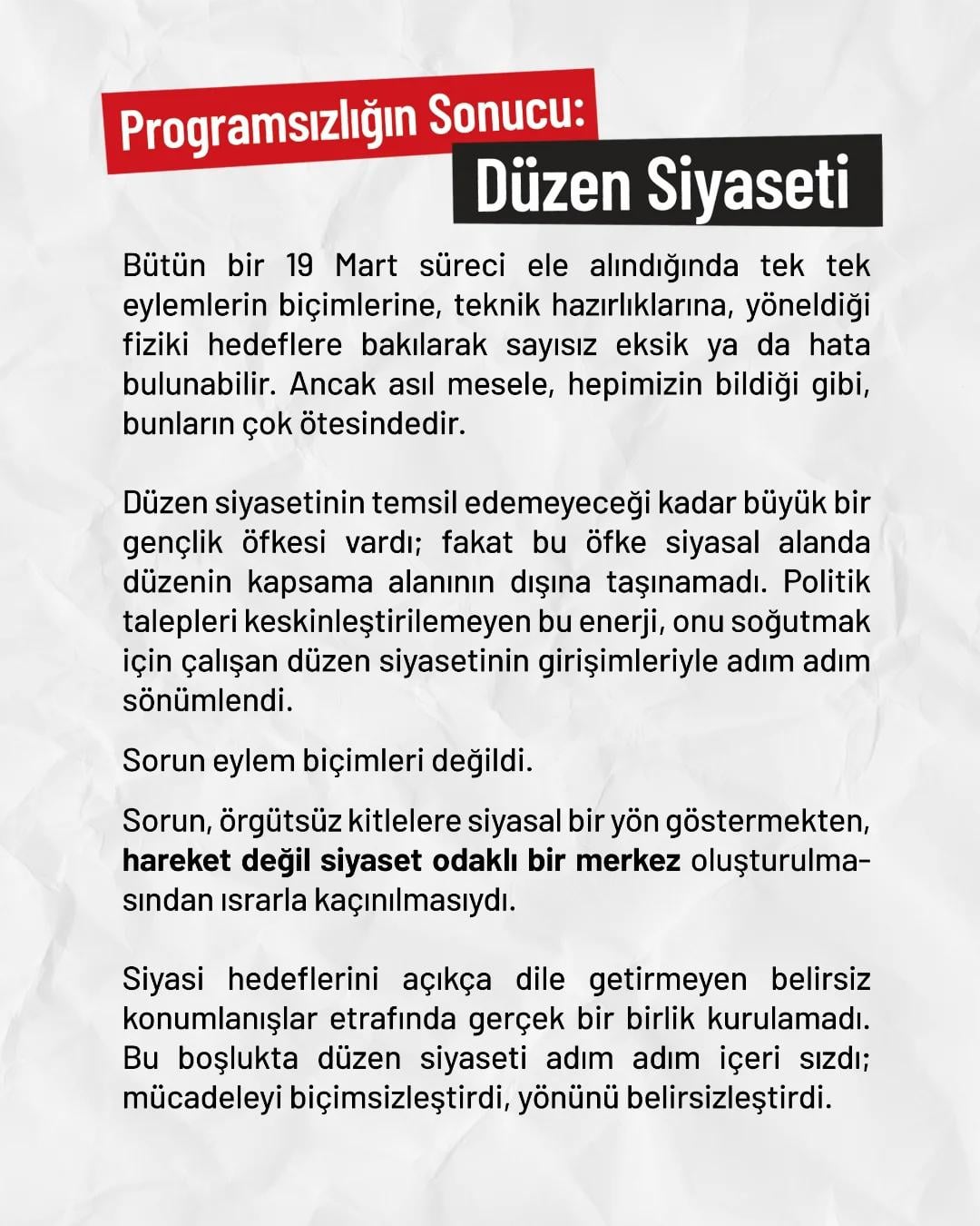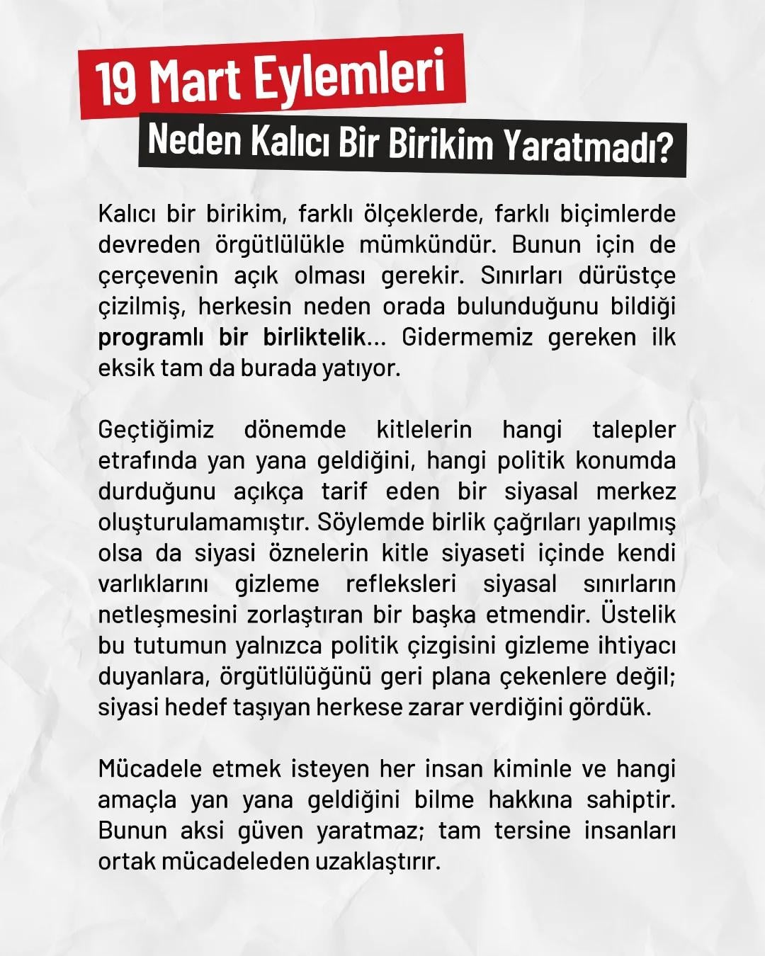 Aposever iktidar partileri, aposever muhalefet partisine haksızlık ve zulüm yapıyor, yesinler birbirlerini demeden, haksızlık haksızlıktır, zulüm zulümdür mantığı ile yazılmış, buna ve mevcut  yoksulluk, işsizlik, tarikat karanlığı, geleceksizliğin baskısı gibi mevcut sorunlar için örgütlü hareket edilmeli denmiş bildiride. Chp’nin ve partili siyasi figürlerinin isminin kullanılmaması yerinde olmuş.