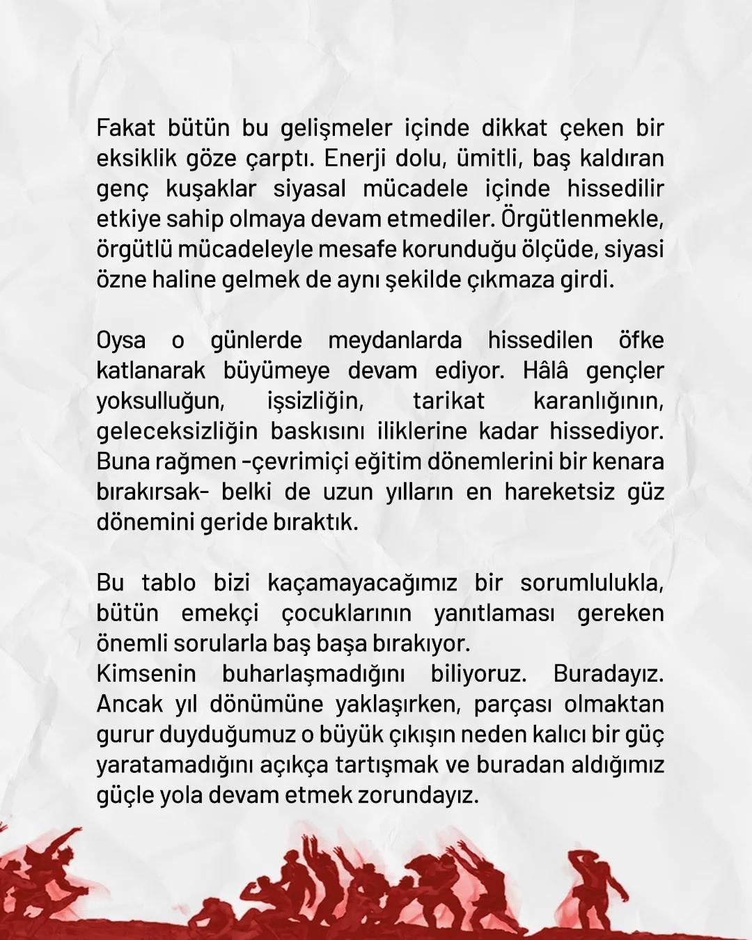 Ma la rabbia sentita nelle piazze in quei giorni continua a crescere in maniera esponenziale. I giovani sentono ancora nel profondo la pressione della povertà, della disoccupazione, dell’oscurità delle sette e della mancanza di futuro. Nonostante ciò, lasciando da parte i periodi di formazione online, forse ci siamo lasciati alle spalle il semestre autunnale più inattivo degli ultimi anni. Questo quadro ci lascia con una responsabilità a cui non possiamo sottrarci, con domande importanti a cui tutti i figli dei lavoratori devono rispondere.