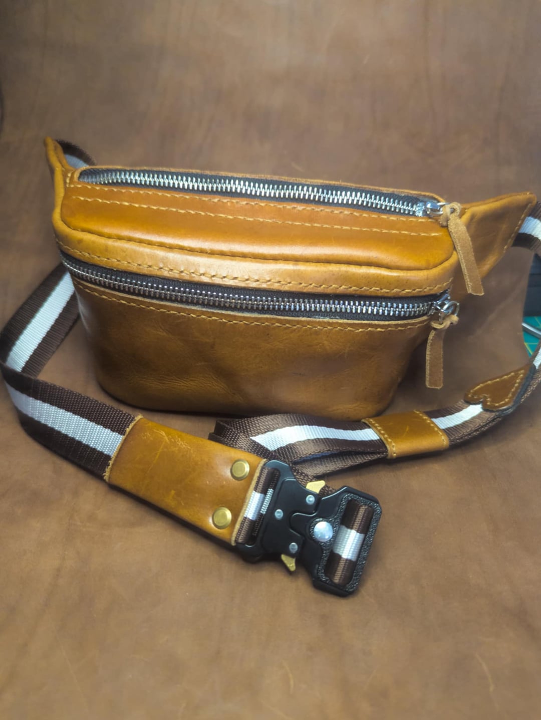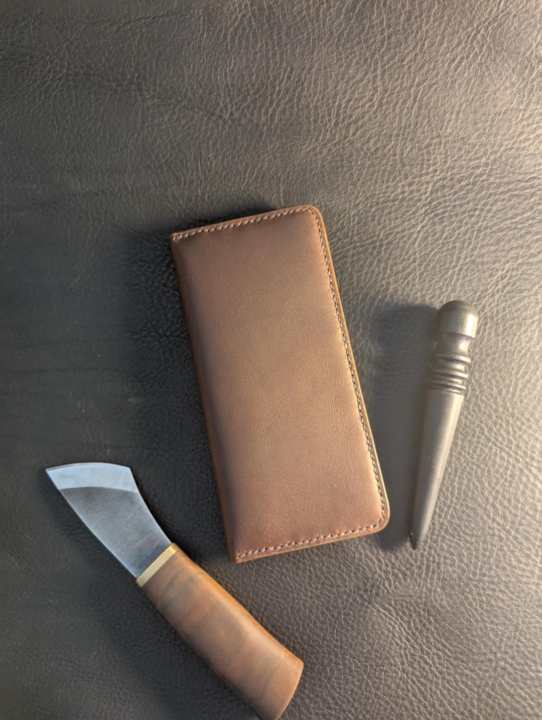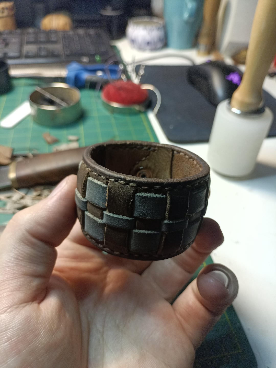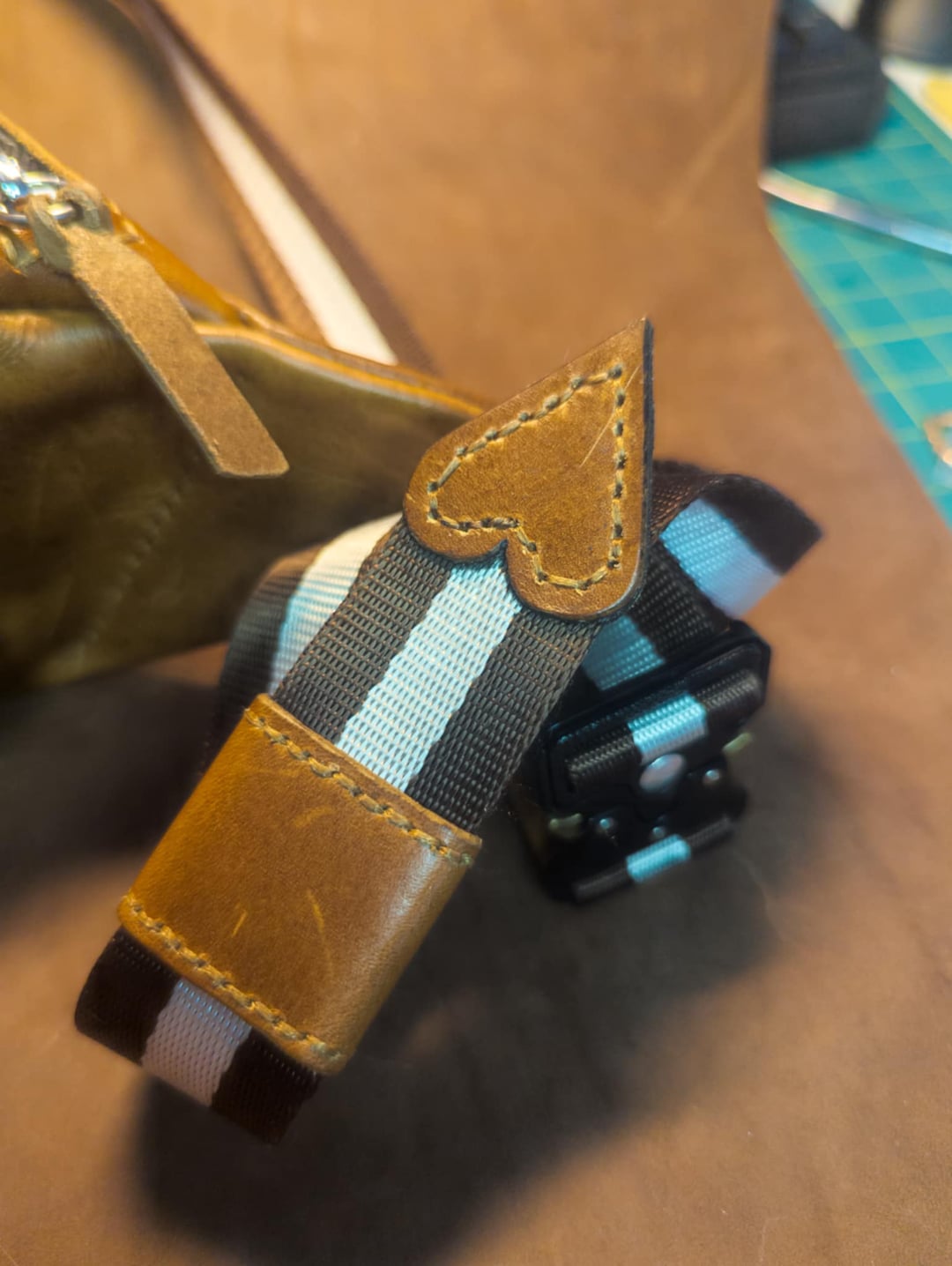 Per me quello è diventato un piccolo hobby di lavorazione della pelle. Mentre lavoravo in una fabbrica qui, ho avuto accesso a ritagli di pelle che erano troppo piccoli o imperfetti per la produzione industriale, ma erano comunque ottimi materiali per piccoli progetti fatti a mano. Invece di buttarlo via, ho iniziato a sperimentare e cercare di imparare.
