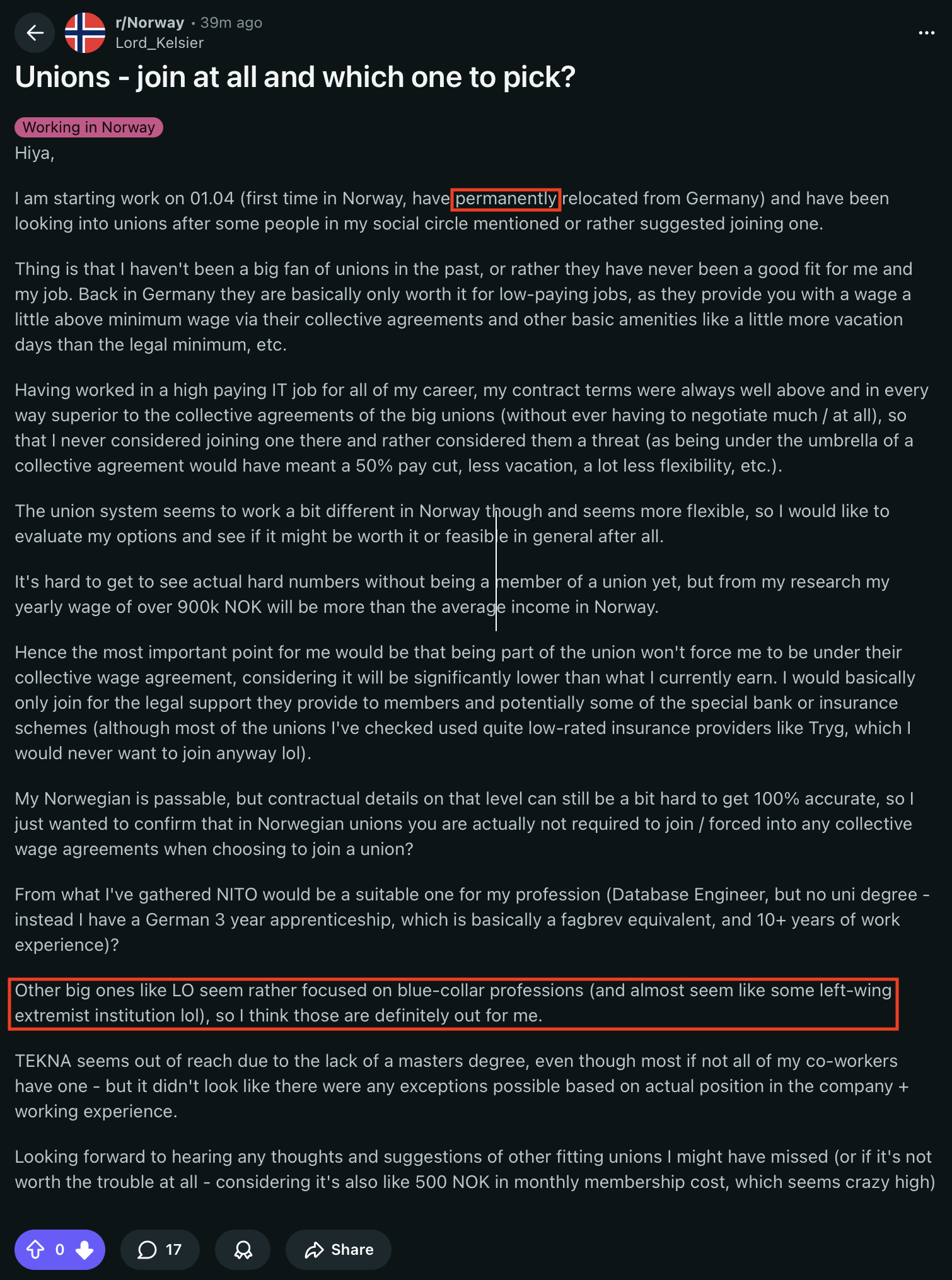 Sono davvero confuso: se qualcuno ha opinioni così negative sulla Confederazione norvegese dei sindacati (LO), perché vorresti vivere e lavorare permanentemente in Norvegia?