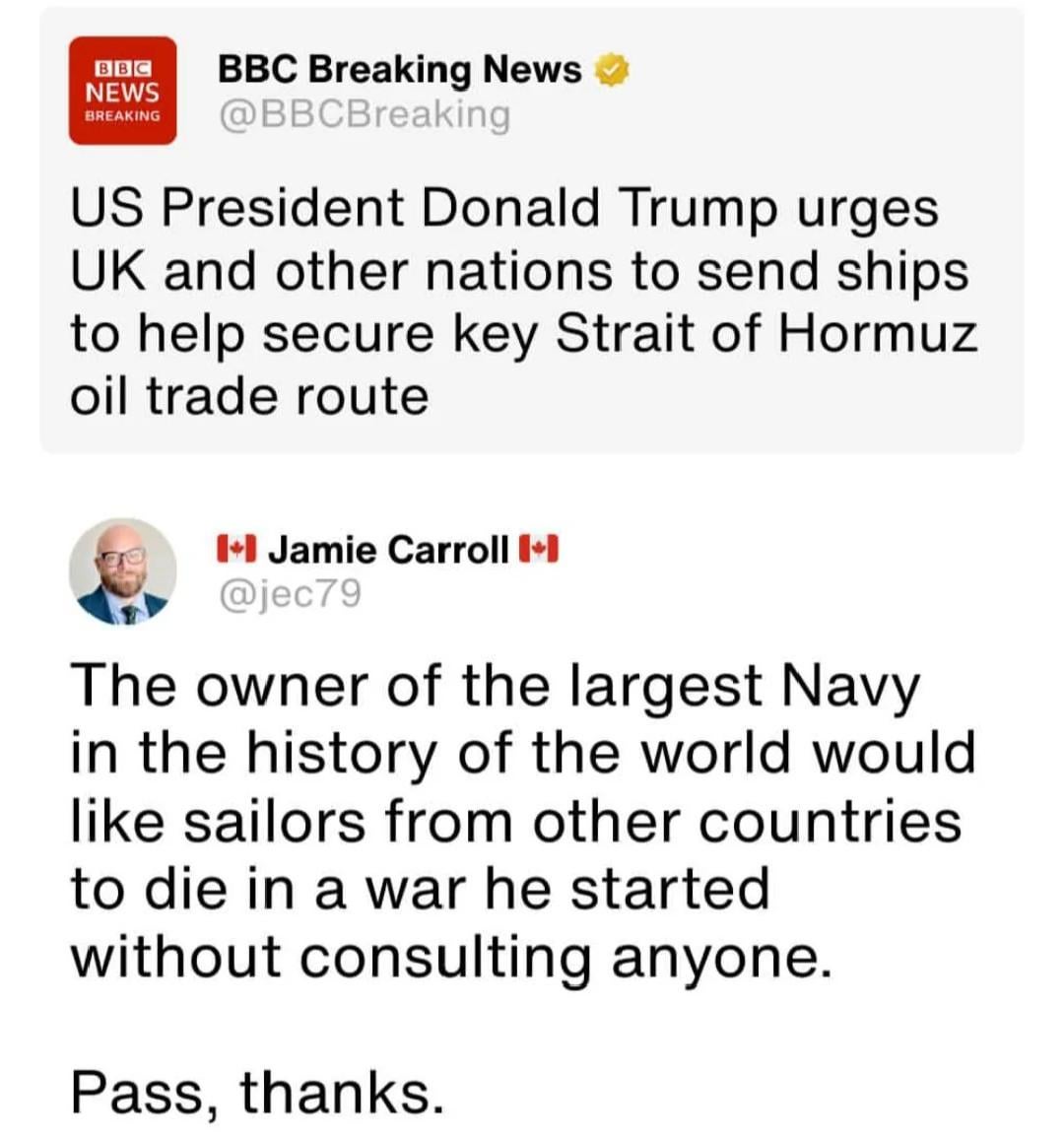 Grazie a Dio non abbiamo una forza navale potente, ma Trump ha pensato che saremmo stati obbligati a seguirti come un cane https://i.redd.it/hzshydtcuqpg1.jpeg di JumpApprehensive9949