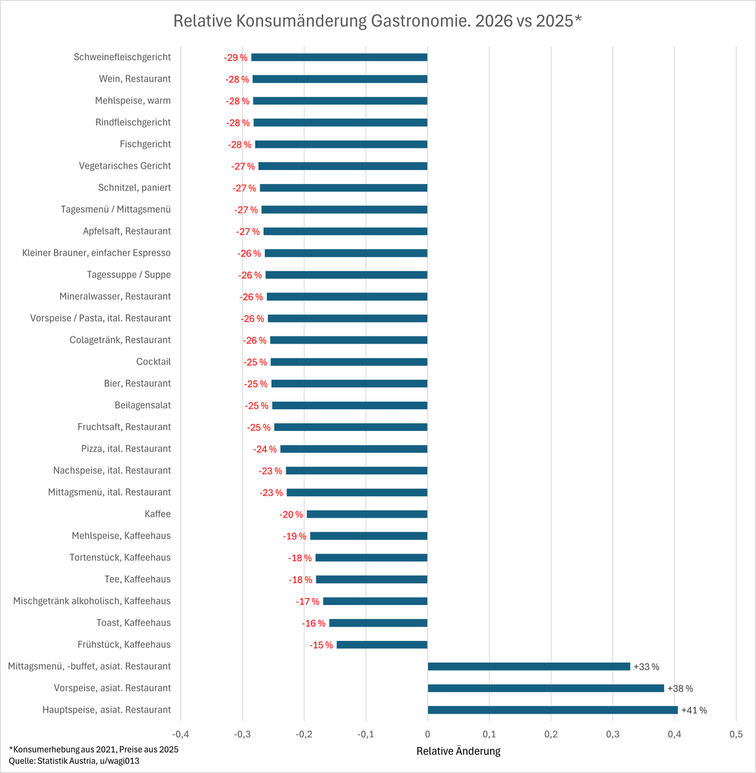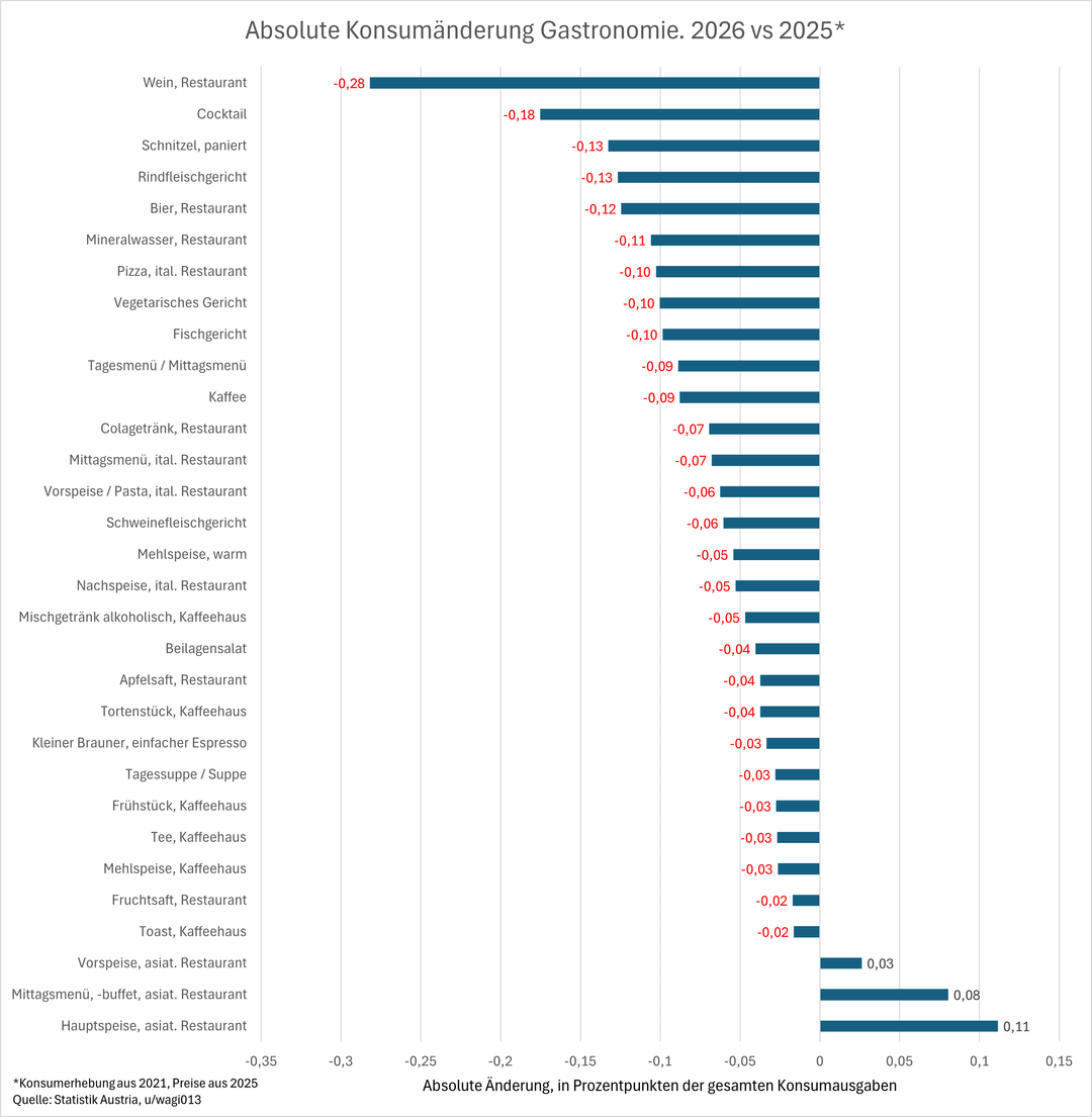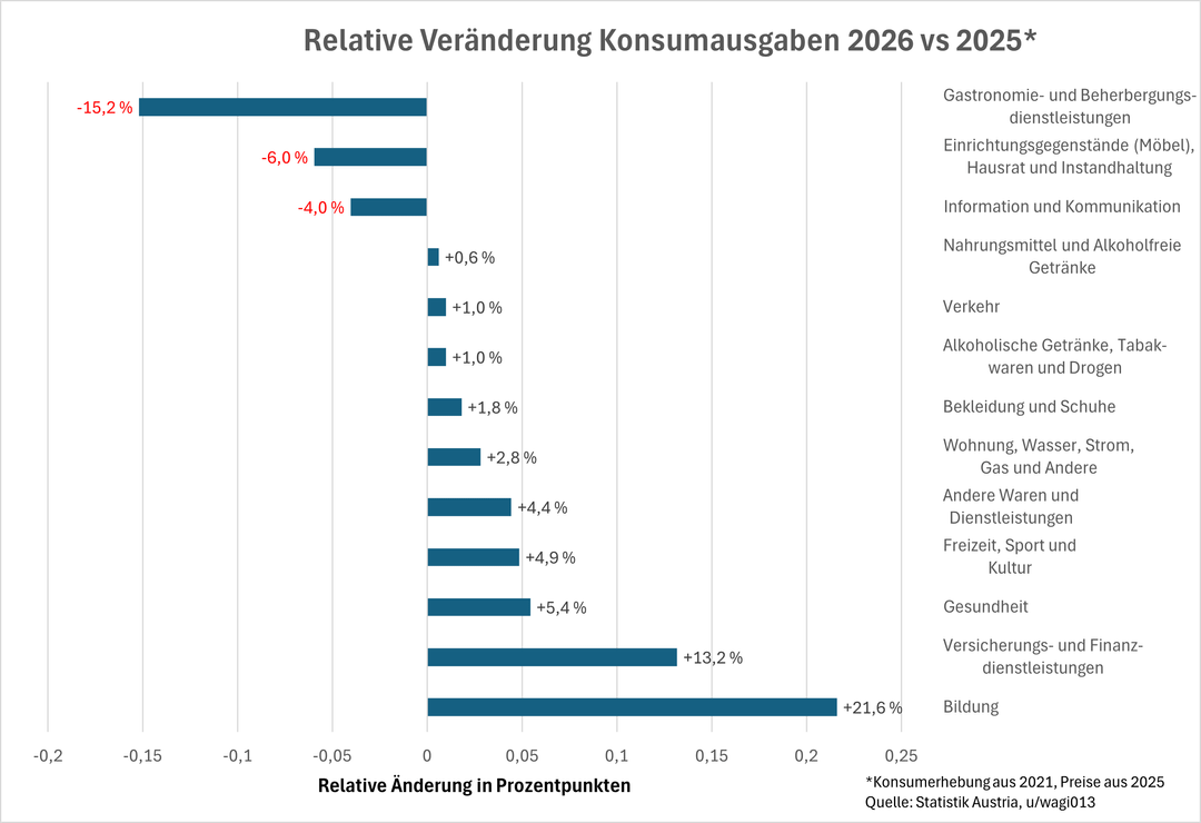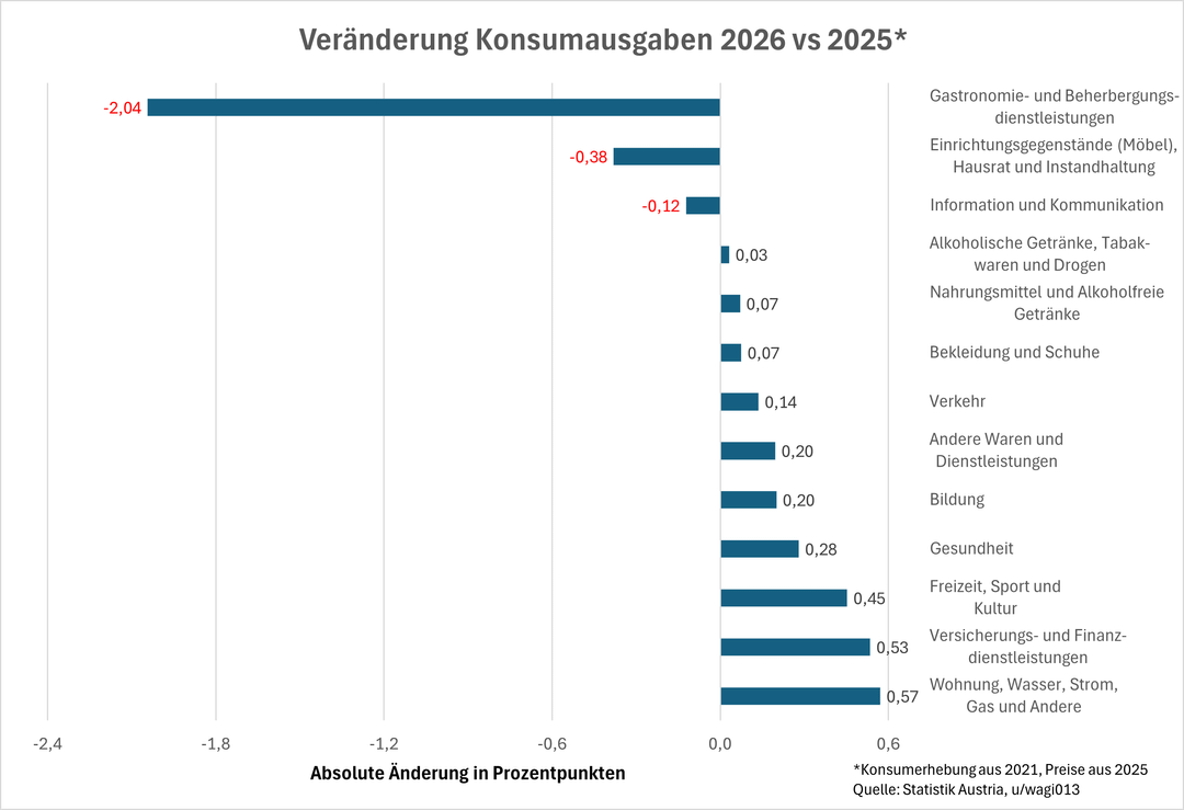 Tutti i dati si riferiscono a VPI (ovvero il consumo delle persone che vivono in Austria). I cambiamenti avvengono da un lato attraverso l’inflazione e dall’altro attraverso i cambiamenti nel comportamento dei consumatori.