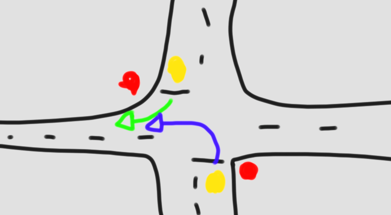 Sono molto confuso su come funziona la priorità per questo tipo di situazione? Sono il tizio con la freccia blu e sono arrivato prima all’incrocio con circa un secondo rispetto al tizio con la freccia verde. Stavo aspettando che il ragazzo con la freccia verde andasse per primo dato che lui aveva svoltato a destra mentre io dovevo girare a sinistra.