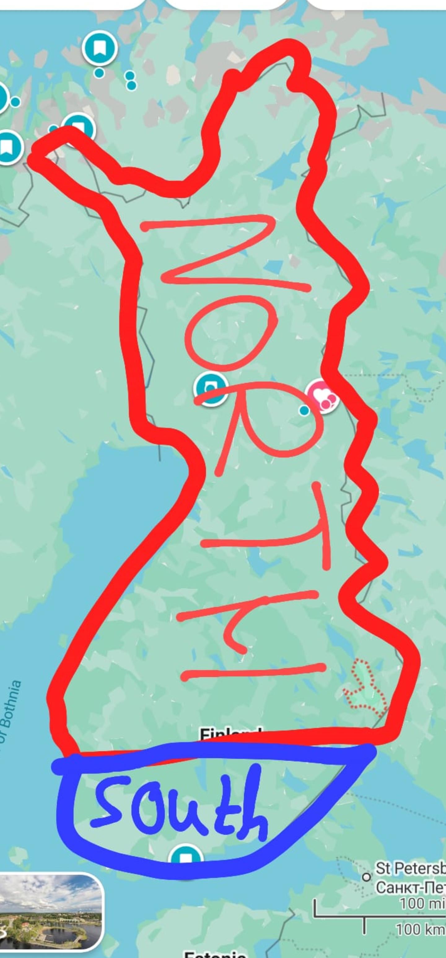 Well, to be fair about half the population lives in that blue “south” area in the map so it divides the population in about half. But personally I think southern Finland is up to Tampere, and northern Finland is from Kainuu and up. Between them is the central Finland.