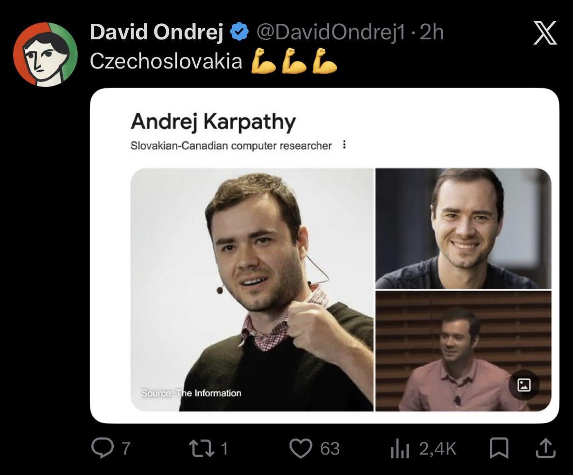 L’ho notato anche dopo aver visto il film Nepela, quando ci penso google si troverebbero sicuramente dettagli o altri esempi. Andrej Karpathy, nato a Bratislava e vissuto a Košice fino all’età di 15 anni, si è trasferito in Canada con i suoi genitori nel 2008, e qualcuno stranamente lo definisce ‘cecoslovacco’.