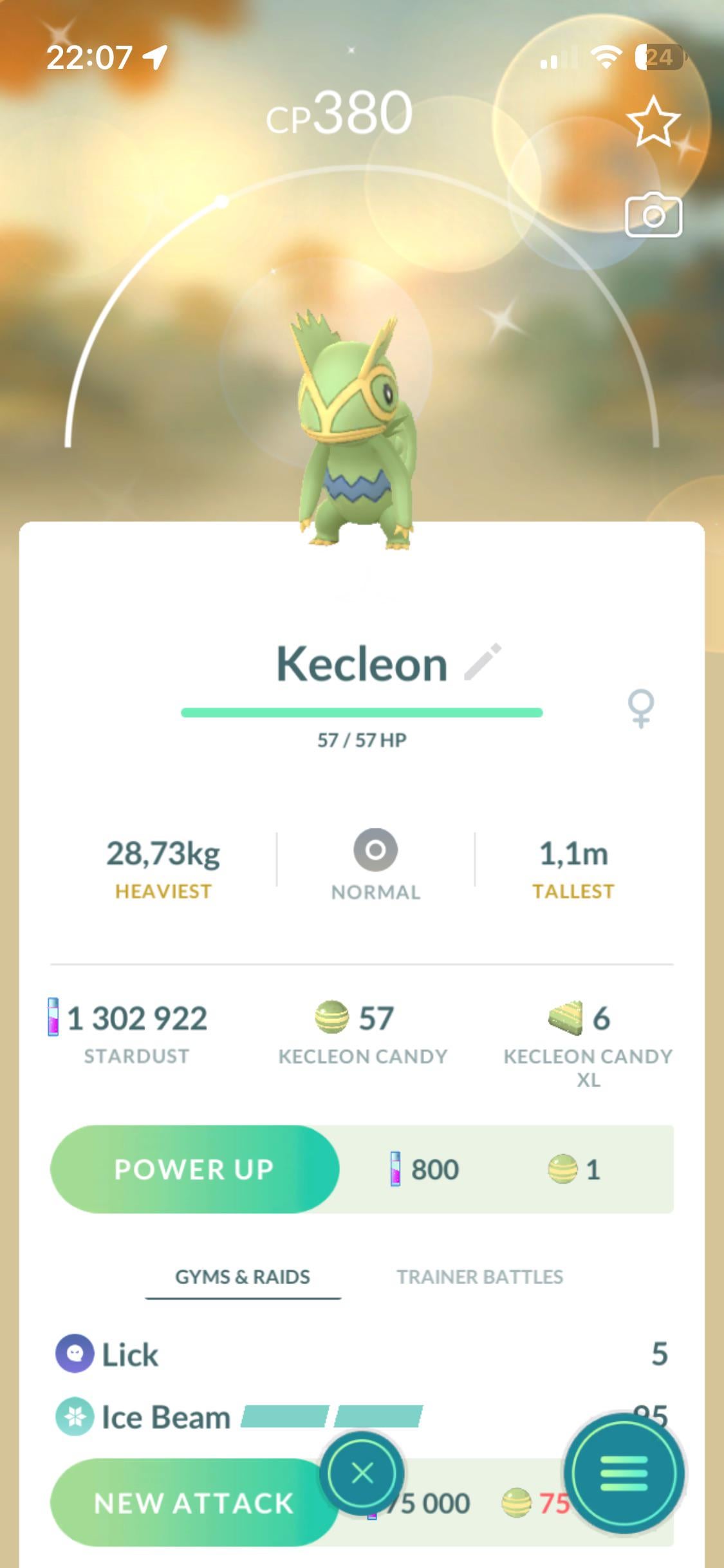 Oggi ho avuto fortuna con questo pezzo (Shiny Kecleon). Per chi non lo sapesse: in questo gioco si tratta fondamentalmente di un Pokémon “invisibile” in cui bisogna imbattersi in un Pokéstop, e le possibilità che abbia quella barra rossa sono assolutamente minime.
