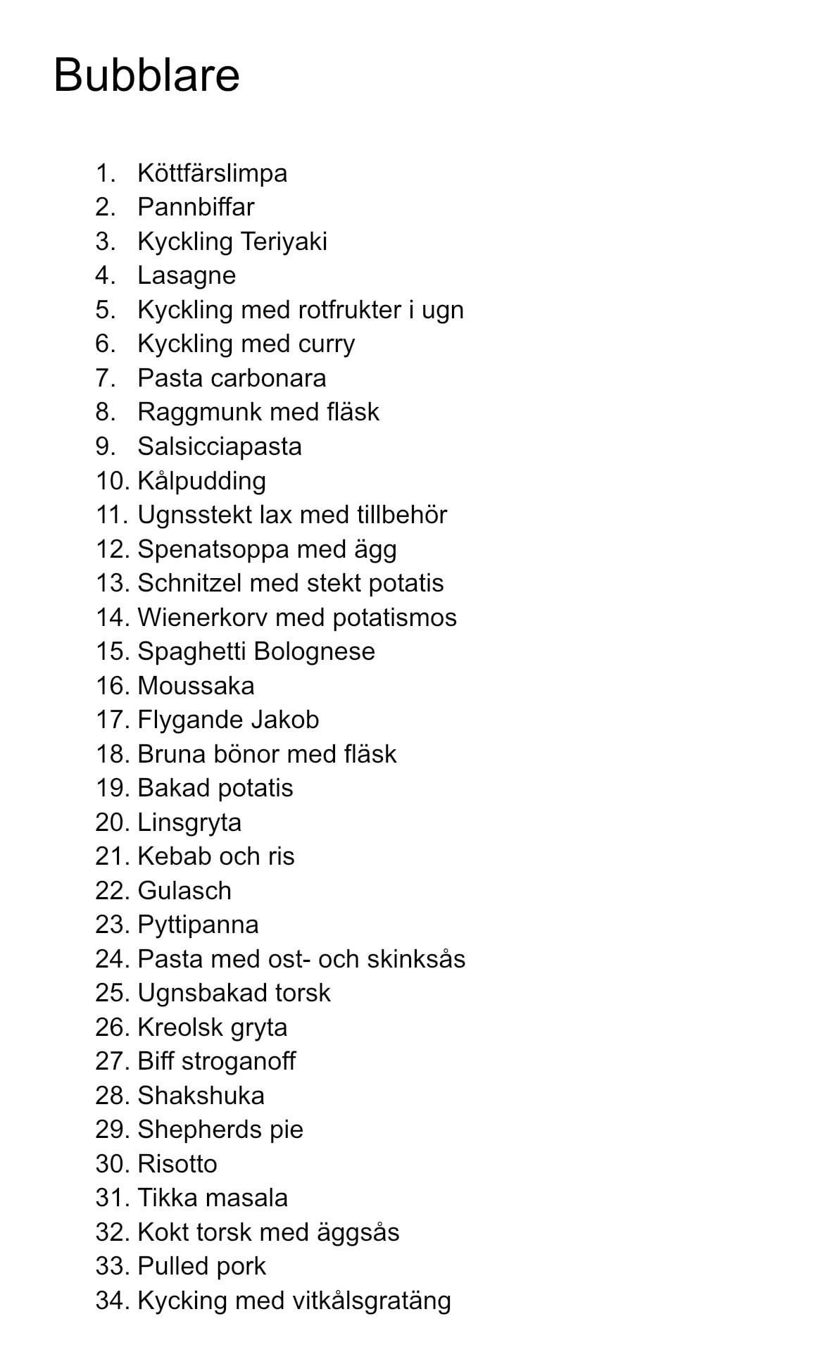 Recentemente ho creato un record (https://www.reddit.com/r/sweden/s/iW3COxyBD9) dove chiedevo aiuto con consigli sull’alimentazione quotidiana. Adesso ho raccolto gran parte di tutti i consigli che ho ricevuto in una nuova lista alla quale la famiglia potrà partecipare e decidere quali piatti lasciare. Alcuni dei suggerimenti che ho ricevuto erano più legati al fine settimana in quanto richiedevano un po’ più di impegno e quindi finiscono nell’elenco del fine settimana.