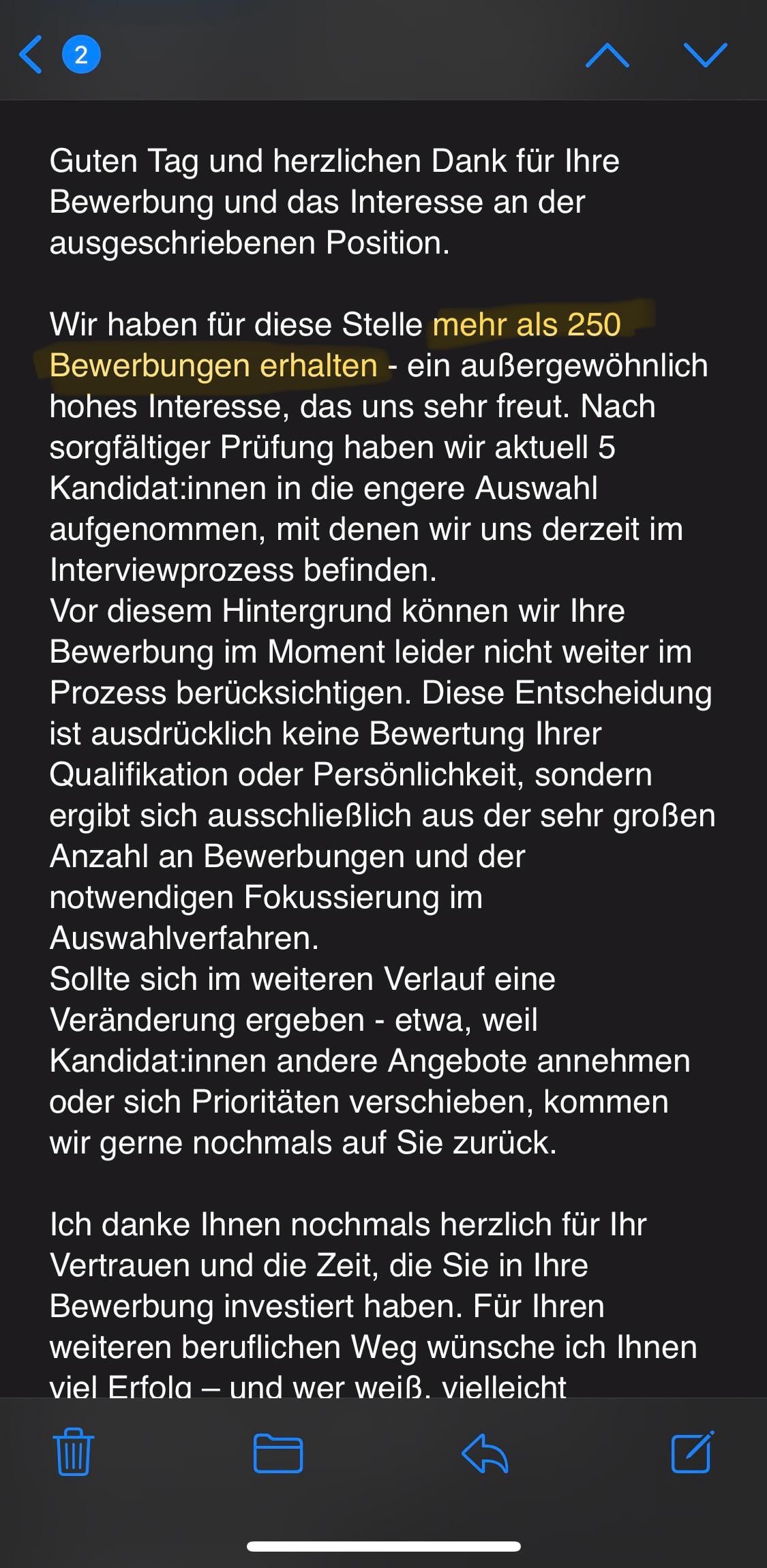 flohhhh on 19/03/2026 15:58 Selbst wenn ich 3 Bewerbungen hätte und eine Absage rausgeben muss, mach ich das. Wertigkeit des Unternehmens erscheint hoch, Wert des Bewerbers niedrig, man muss die Arbeiterklasse klein und im Selbstzweifel halten.