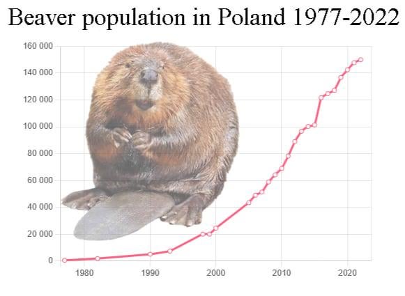 I numeri esatti vengono spesso messi in discussione, poiché i castori non sono facili da contare, ma la crescita della popolazione è evidente e molto rapida – 50 anni fa c’erano circa 500 castori in Polonia, oggi quel numero è stimato a circa 150.000 – 300 volte più castori in 2 generazioni