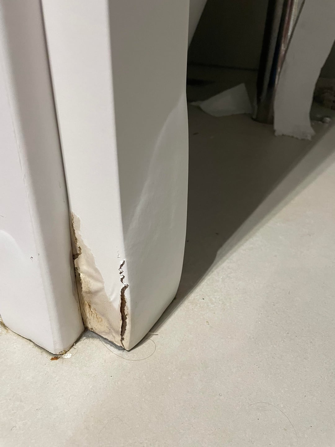 Quindi il mio appartamento era nuovo di zecca quando mi sono trasferito e penso che potrebbe essere stato costruito male. Vivo come una persona normale. Come puoi vedere, la porta del mio bagno ha questo danno perché quando faccio la doccia si forma sempre una pozzanghera sotto la porta, come se il pavimento non fosse a livello o qualcosa del genere. L’ho coperto con un asciugamano ma non è servito a nulla. Anche le piastrelle della mia cucina presentano questo danno. Non cucino spesso, non ho apparecchi pesanti, ecc. Cosa devo dire al mio padrone di casa?