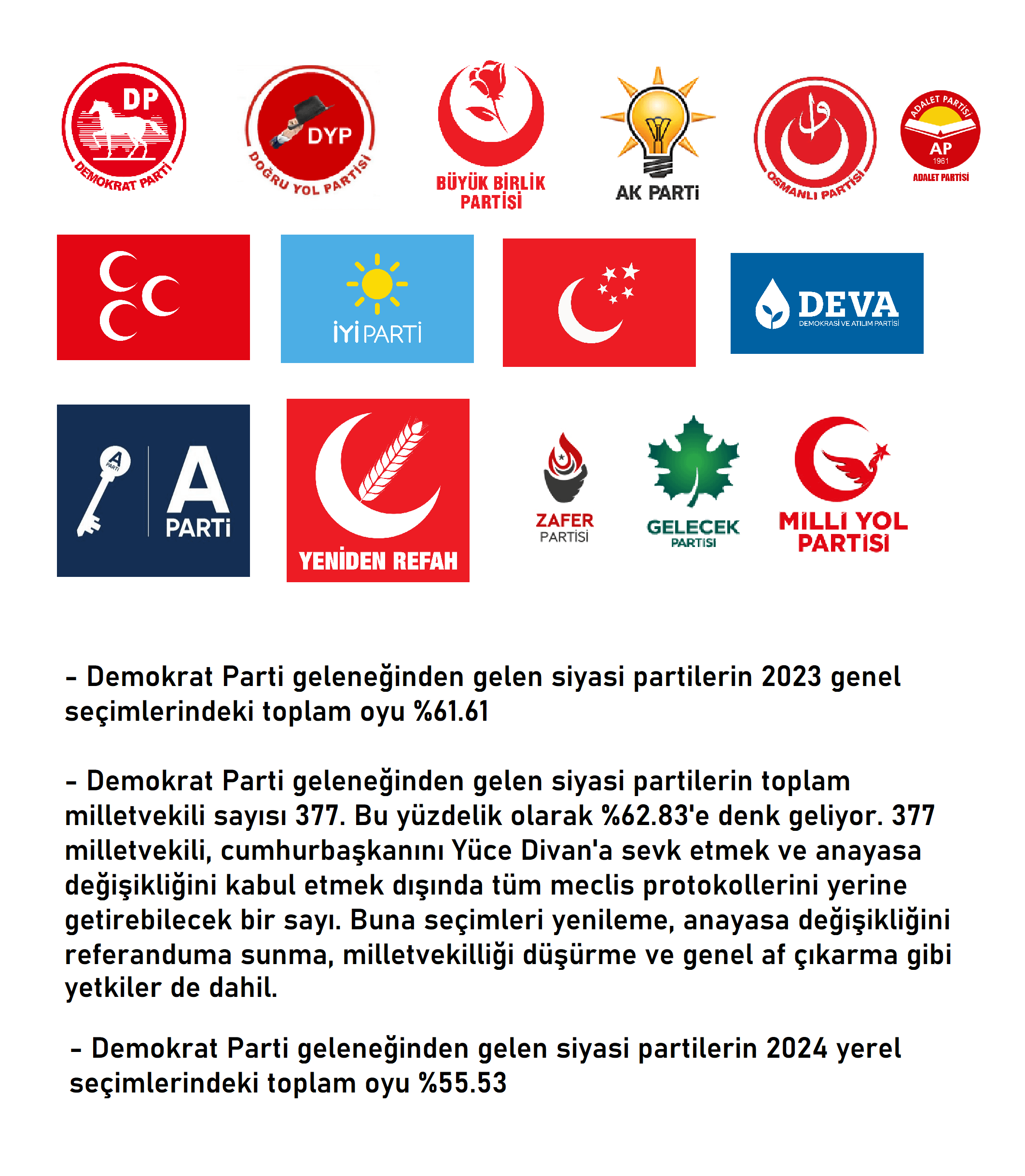 Partito Democratico (1946) -> Partito della Giustizia (1961) -> Partito Grande Türkiye -> Partito della Via Vera (1983) -> Partito Democratico (2007)
