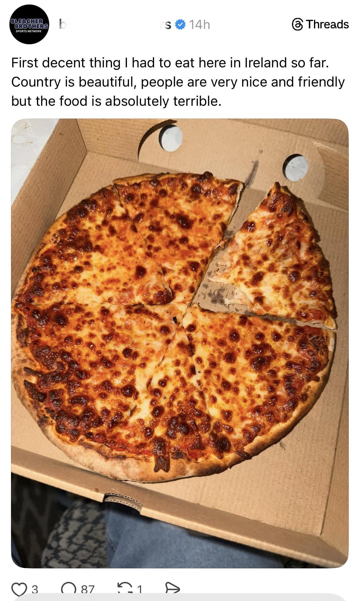 If they think a pizza is the best thing they’ve had here then the person is a gobshite who only eats processed food. They’d have the same opinion everywhere that isn’t the US.