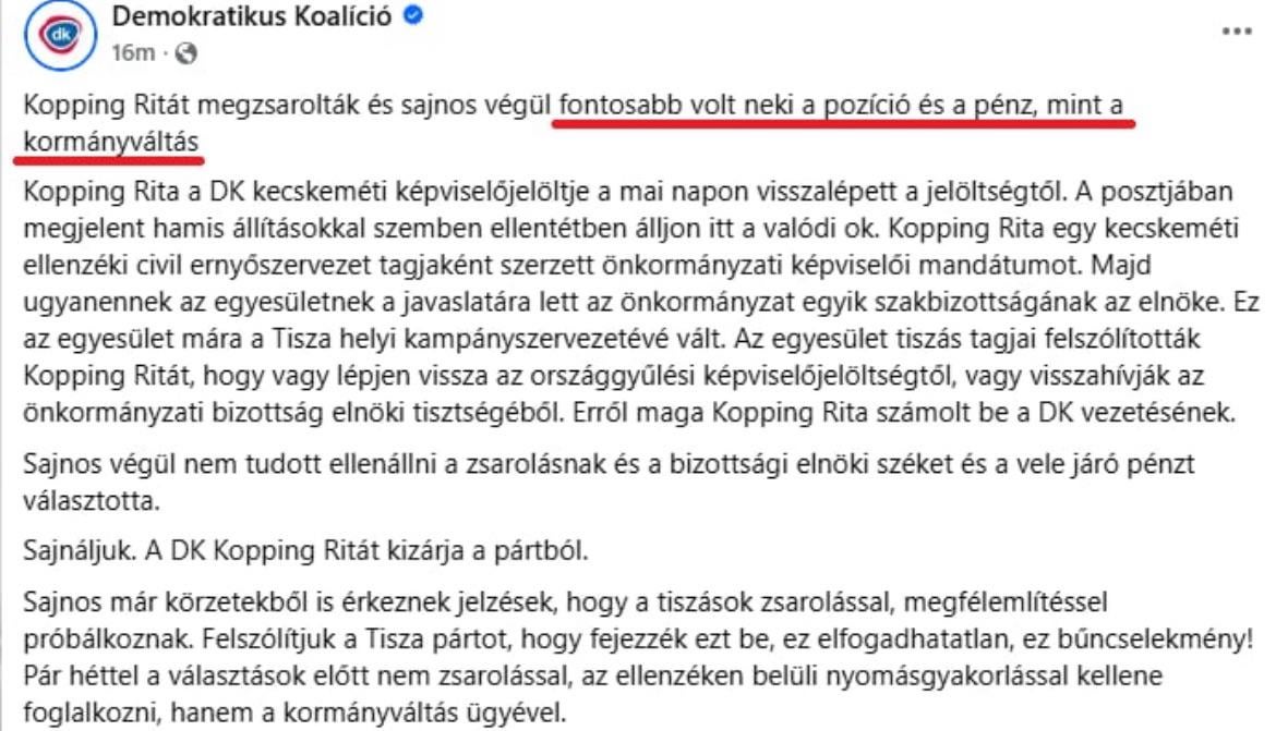 Hazudnak, már maga az érintett is cáfolta a DK hazugságait: “Teljesen fals információ. A kecskeméti szövetségünkben, a Szövetség a Híres Városért Egyesületben nincs egyetlen tiszás tag sem, így fel sem merült, hogy ők zsaroltak volna – mondta Kopping Rita, kecskeméti önkormányzati képviselő és DK-s jelölt, amikor visszalépésének állítólagos és valódi okairól kérdeztük.”