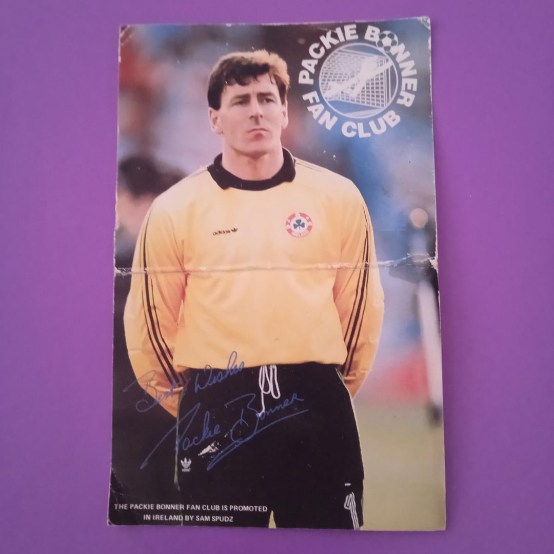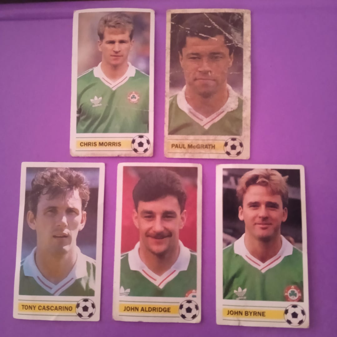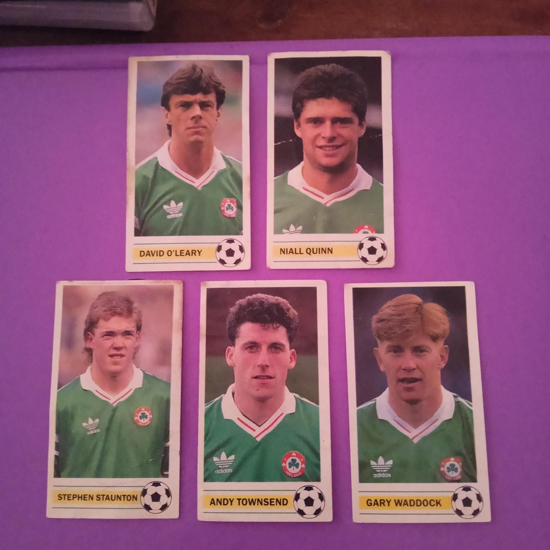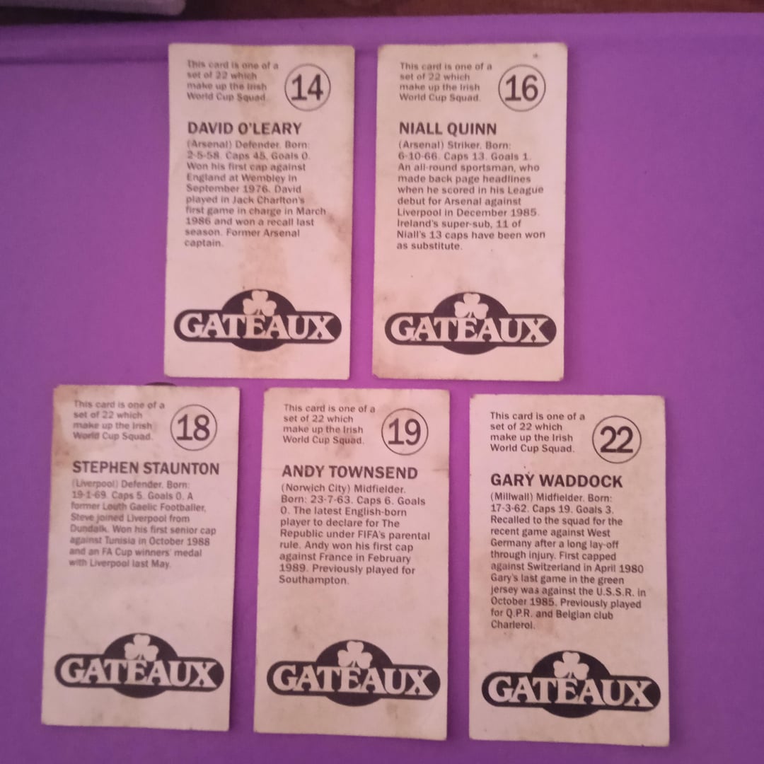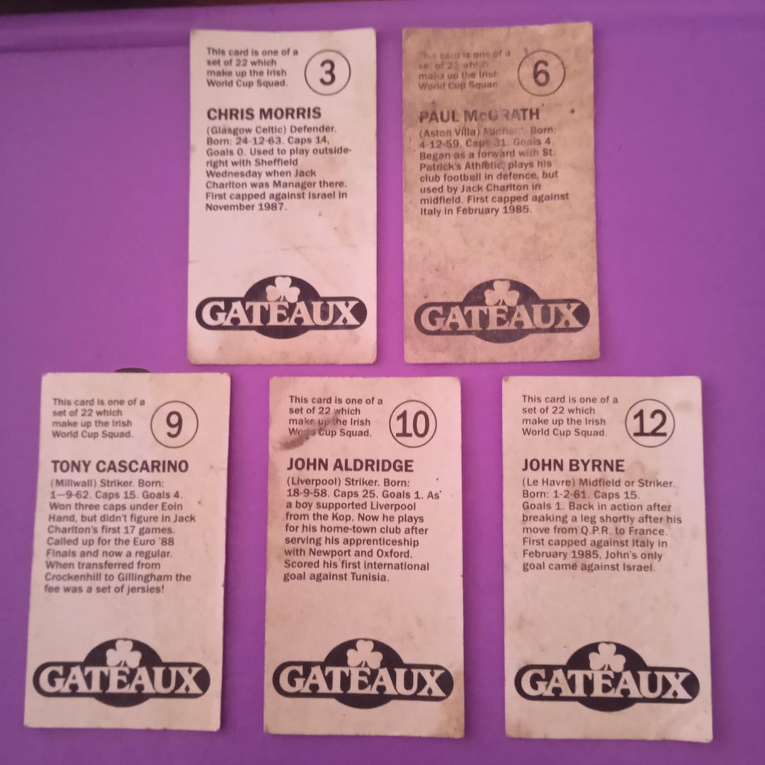 "Devo Getta Gateaux Devo Getta Gateaux Cake Se lo vuoi appena sfornato, Devi Getta Gateaux Cake. Ricordi questi? Mi chiedo: esiste ancora un set completo là fuori? Inoltre, ero un membro del fan club di Packie Bonner. Se ricordo bene è stato collezionando gettoni di Sam Spudz su pacchetti di patatine simili al fan club di Barry McGuigan, potrebbe essere sbagliato. Li ho trovati nascosti in una scatola di dolciumi nella mia soffitta dalla fine degli anni ’80 all’inizio degli anni ’90.