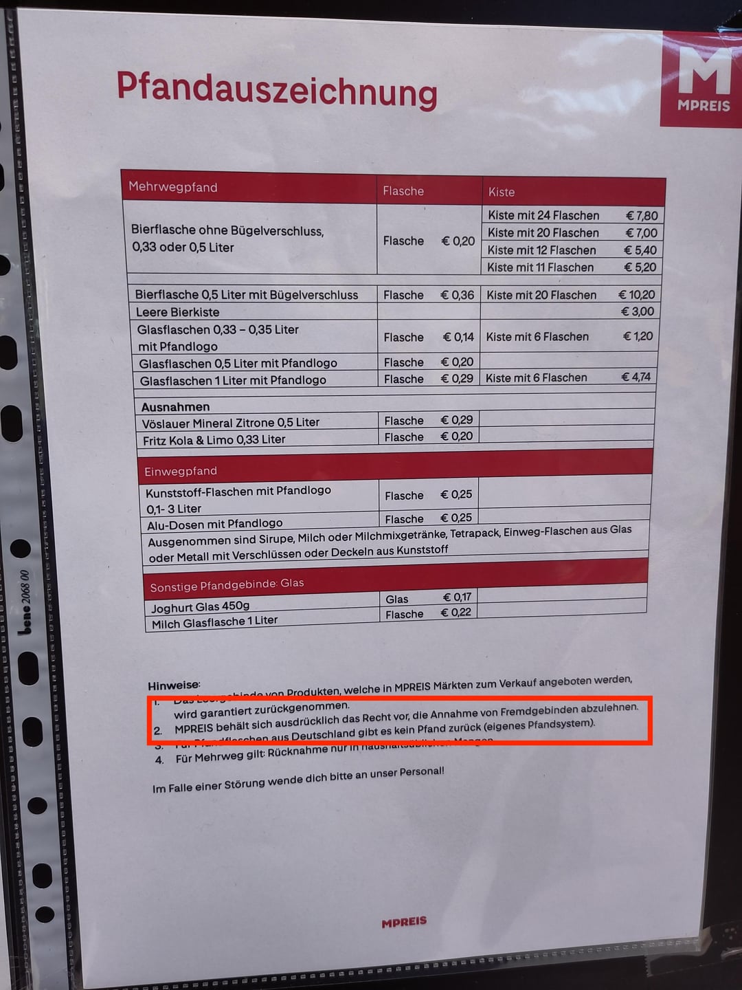 Si blocca proprio accanto a una macchina di deposito MPREIS dove puoi OBBLIGATORIO hanno inoltre il diritto di riprendersi i depositi di terzi.