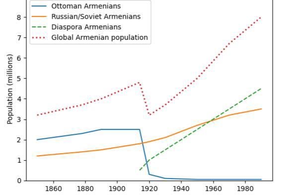 Fino all’inizio del XX secolo, gli armeni nell’impero ottomano contavano circa 2,5 milioni e formavano un’importante popolazione indigena. Dopo il genocidio armeno, quella popolazione crollò (gli armeni nascosti non sono inclusi nel grafico).