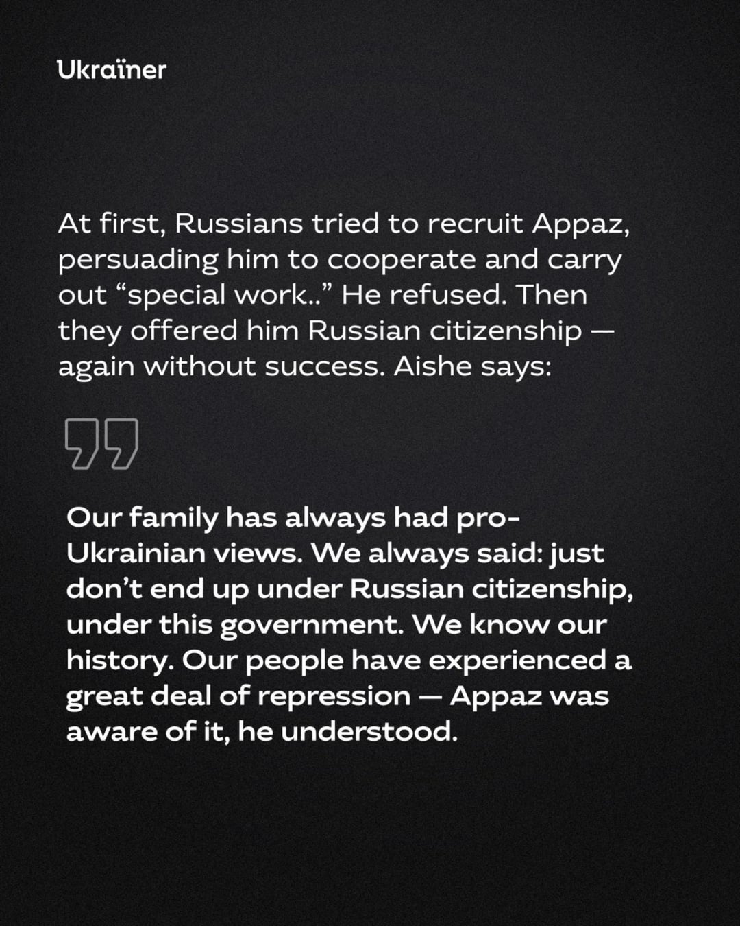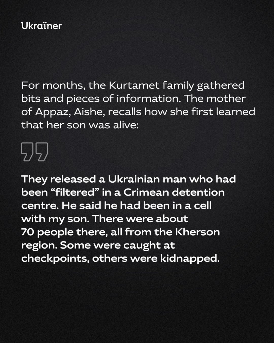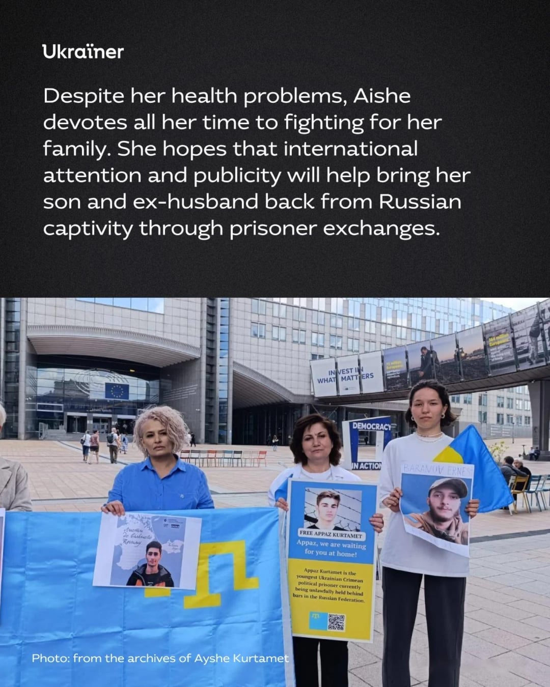 We spoke with Aishe Kurtamet, a Crimean Tatar woman who is fighting for the return of her son Appaz and her ex-husband, Khalil Kurtamet, from Russian captivity. She talks about the ongoing persecution of Crimean Tatars by Russia and the unfounded accusations against her family.