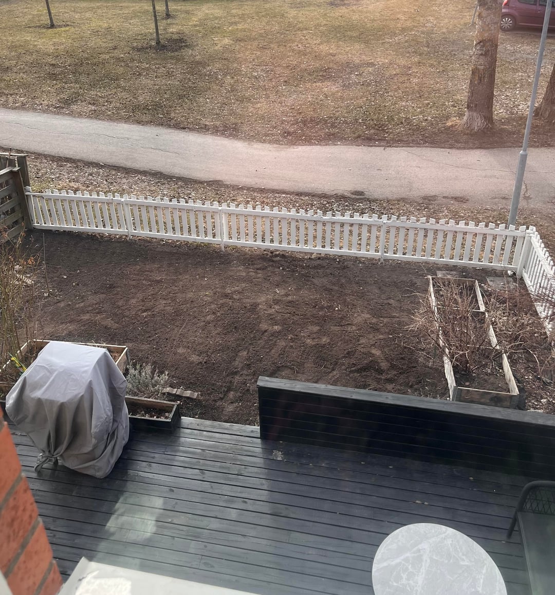 >Marken lutar ned mot staketet/vägen, framför allt de sista 1–2 metrarna närmast staketet. Jag funderar på att jämna ut lutningen lite genom att bygga upp en “kil”
