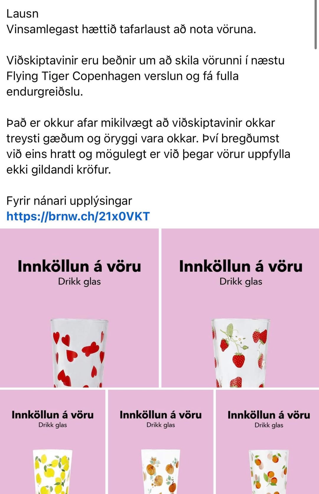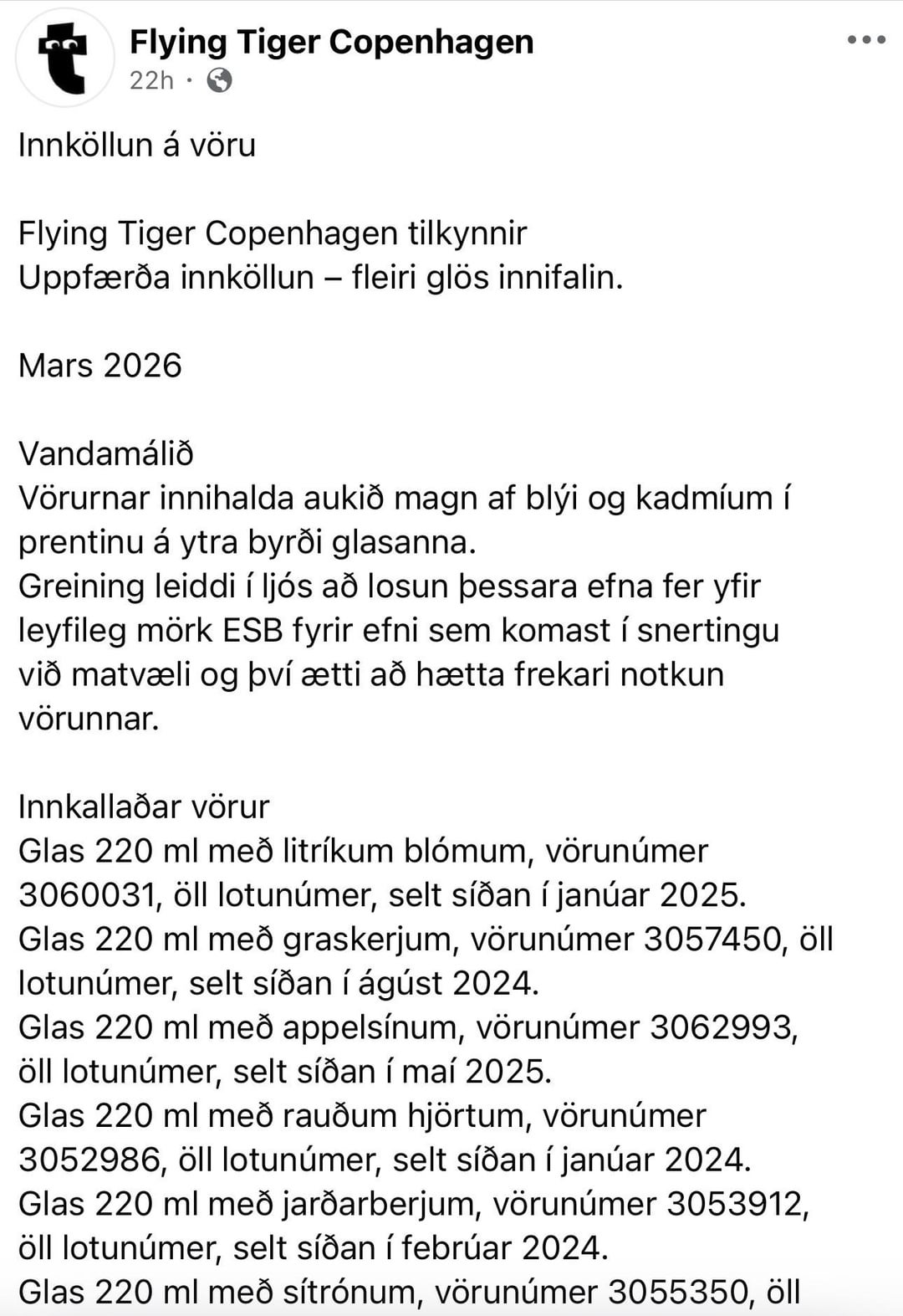 Dato che Flying Tiger non ha un sito web islandese, l’unico modo che hanno per pubblicare questo richiamo è su Facebook, Instagram e nei negozi (spero sinceramente che venga fatto comunque lì). Questo non è arrivato a nessuno dei principali siti di notizie, ad eccezione di MBL a gennaio, ma ora più occhiali sono stati coinvolti in questo richiamo.